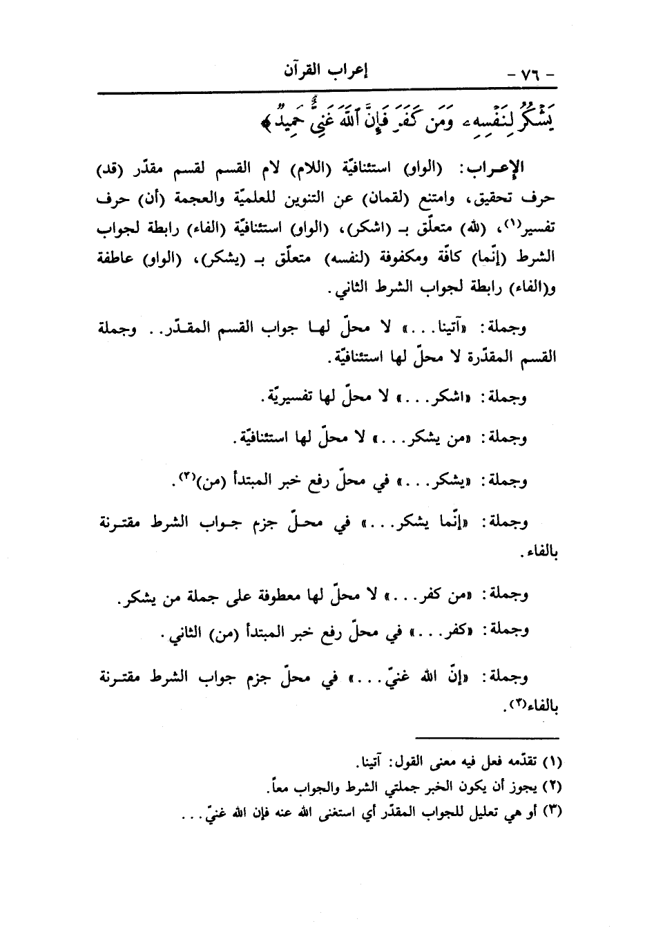 (إلى) حرف جرّ و (الهاء) ضمير في محلّ جرّ متعلّق بخبر مقدّم (مرجع) مبتدأ مؤخّر مرفوع و (كم) ضمير مضاف إليه (جميعا) حال منصوبة من ضمير الخطاب (وعد) مفعول مطلق لفعل محذوف منصوب (الله) لفظ الجلالة مضاف إليه مجرور (حقّا) مفعول مطلق لفعل محذوف (إنّ) حرف مشبّه بالفعل للتوكيد و (الهاء) ضمير في محلّ نصب اسم إنّ (يبدأ) مضارع مرفوع، والفاعل هو (الخلق) مفعول به منصوب (ثمّ) حرف عطف (يعيد) مثل يبدأ و (الهاء) ضمير مفعول به (اللام) للتعليل (يجزي) مضارع منصوب بأن مضمرة بعد اللام (الذين) موصول في محلّ نصب مفعول به (آمنوا) فعل ماض وفاعله مثله (عملوا) ، (الصالحات) مفعول به منصوب وعلامة النصب الكسرة (بالقسط) جارّ ومجرور متعلّق ب (يجزي) «1» .