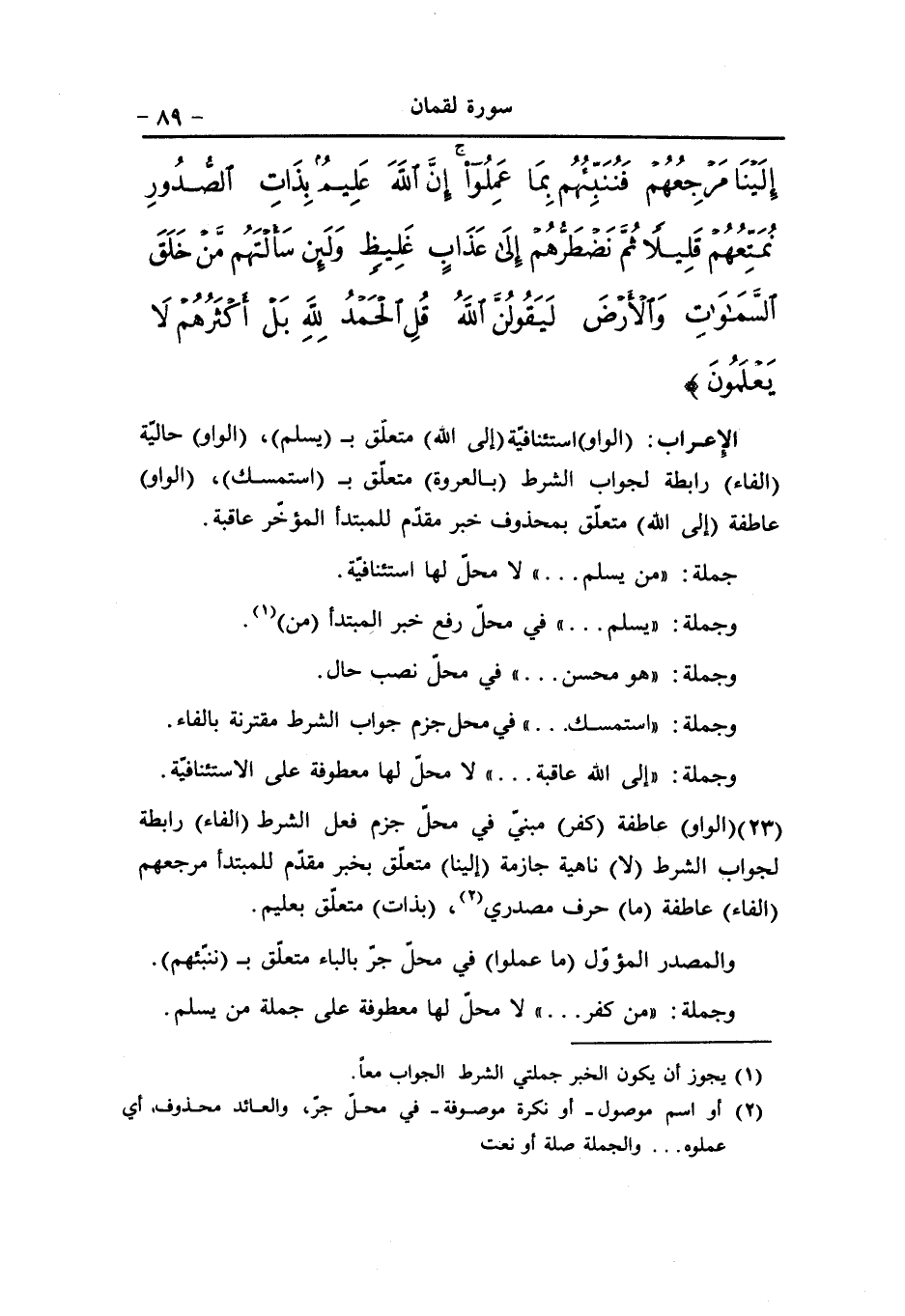 - التقسيم أو صحة الأقسام: وهو عبارة عن استيفاء المتكلم جميع أقسام المعنى الذي هو آخذ فيه، بحيث لا يغادر منه شيئا. وقوله: «دَعانا لِجَنْبِهِ أَوْ قاعِداً أَوْ قائِماً» استوفى جميع الهيئات التي يكون عليها الإنسان وقد تردد التقسيم في آل عمران.
