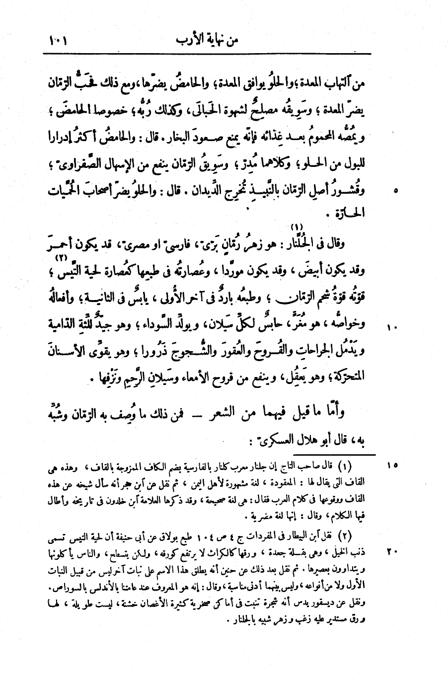 وقال فى الجلّنار «1» : هو زهر رمّان برّىّ، فارسىّ او مصرىّ، قد يكون أحمر وقد يكون أبيض، وقد يكون مورّدا، وعصارته فى طبعها كعصارة لحية التّيس «2» ؛ قوّته قوّة شحم الرّمّان؛ وطبعه بارد فى آخر الأولى، يابس فى الثانية؛ وأفعاله وخواصّه، هو مغرّ، حابس لكلّ سيلان، ويولّد السّوداء؛ وهو جيّد للّثة الدّامية ويدمل الجراحات والقروح والعقور والشّجوج ذرورا؛ وهو يقوّى الأسنان المتحرّكة؛ وهو يعقل، وينفع من قروح الأمعاء وسيلان الرّحم ونزفها.