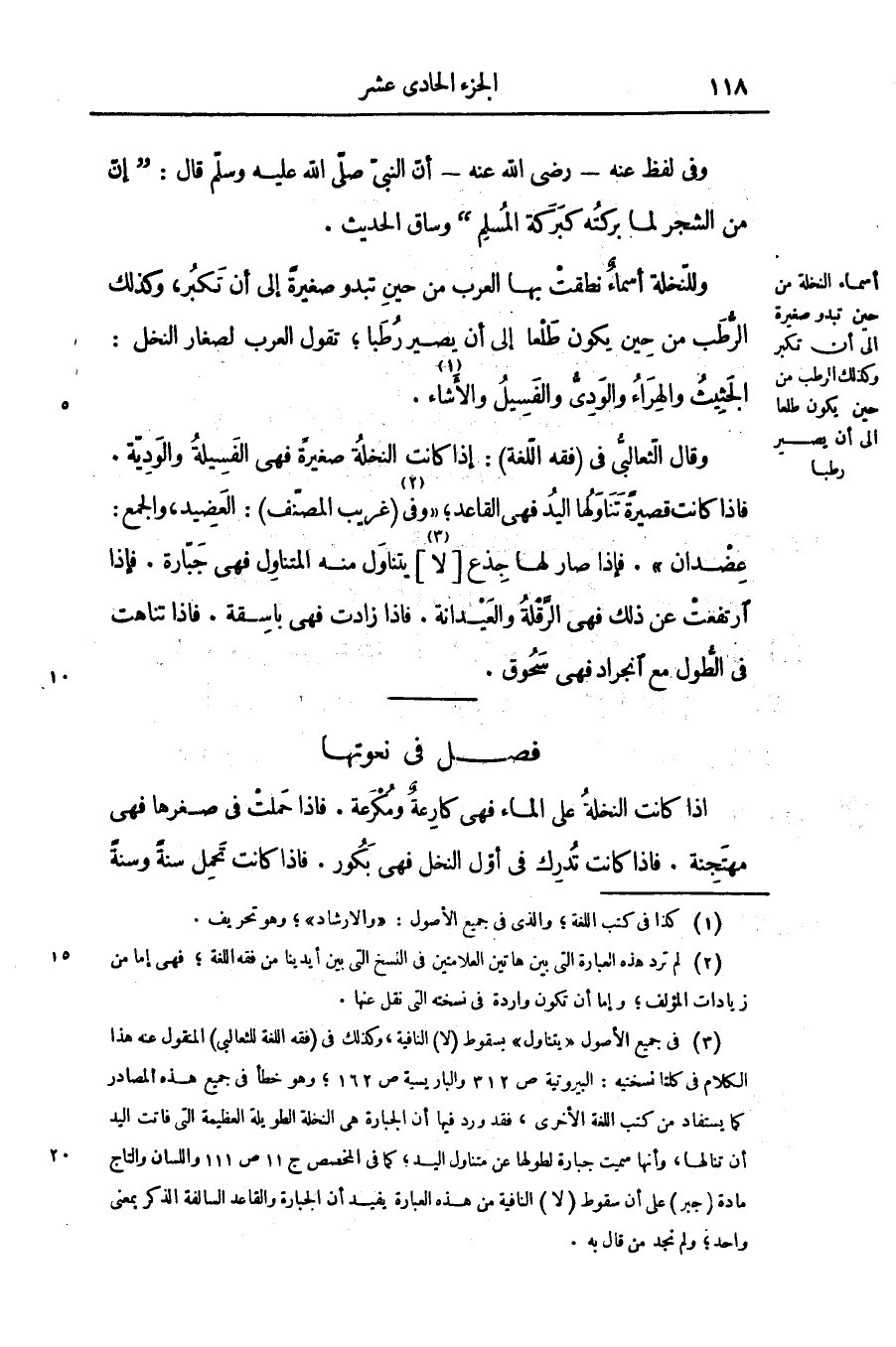 اذا كانت النخلة على الماء فهى كارعة ومكرعة. فاذا حملت فى صغرها فهى مهتجنة. فاذا كانت تدرك فى أوّل النخل فهى بكور. فاذا كانت تحمل سنة وسنة