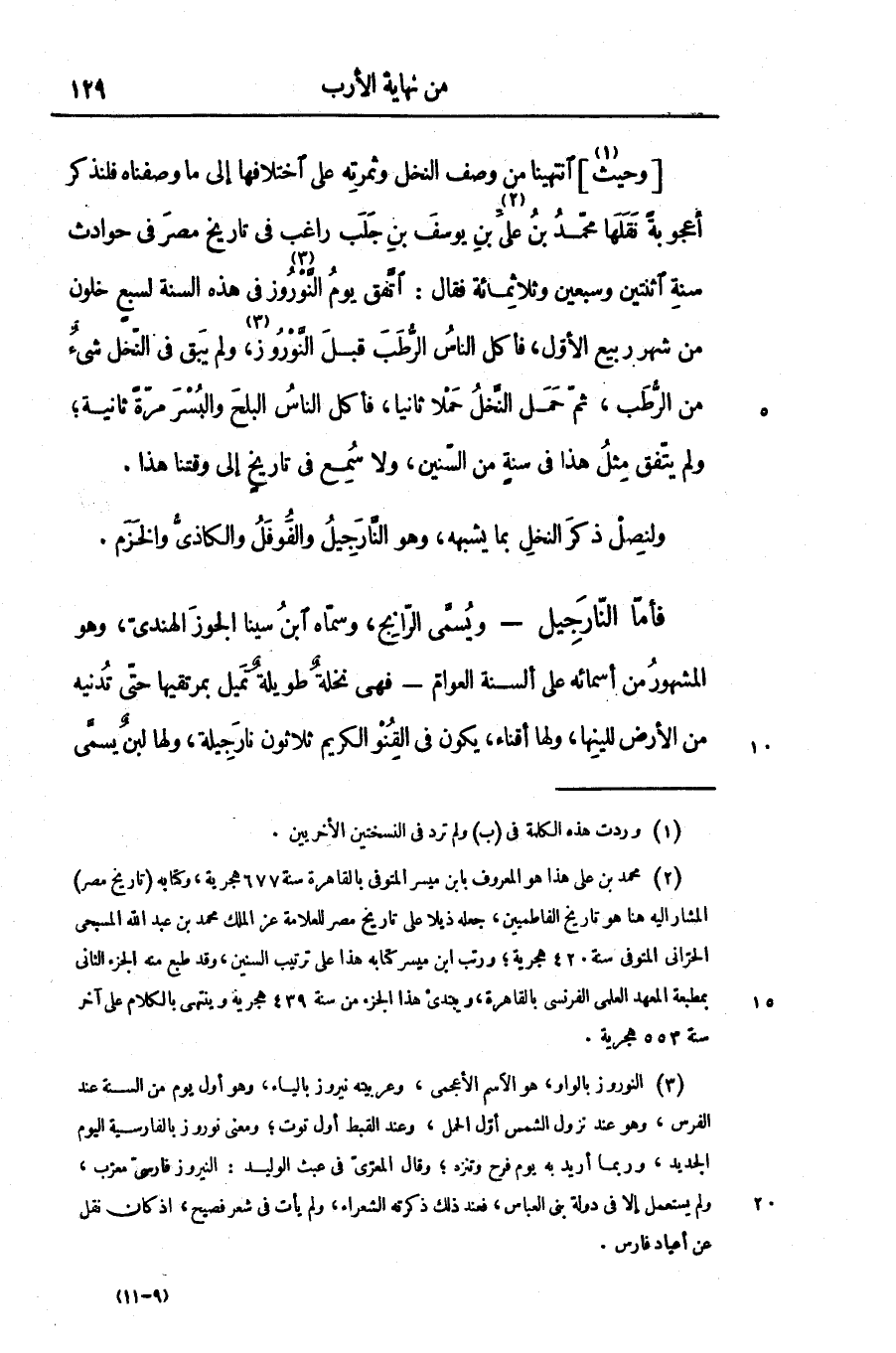 [وحيث «1» ] انتهينا من وصف النخل وثمرته على اختلافها إلى ما وصفناه فلنذكر أعجوبة نقلها محمّد بن علىّ «2» بن يوسف بن جلب راغب فى تاريخ مصر فى حوادث سنة اثنتين وسبعين وثلاثمائة فقال: اتّفق يوم النّوروز «3» فى هذه السنة لسبع خلون من شهر ربيع الأوّل، فأكل الناس الرّطب قبل النّوروز، ولم يبق فى النّخل شىء من الرّطب، ثمّ حمل النّخل حملا ثانيا، فأكل الناس البلح والبسر مرّة ثانية؛ ولم يتّفق مثل هذا فى سنة من السّنين، ولا سمع فى تاريخ إلى وقتنا هذا.