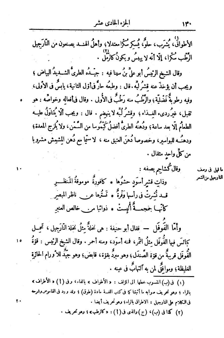 الأطواق «1» ، يشرب، حلو، يسكر سكرا معتدلا؛ وأهل الهند يصنعون من النّارجيل الرّطب سكّرا، إلّا أنّه لا ييبس ويكون كالرّمل «2» .