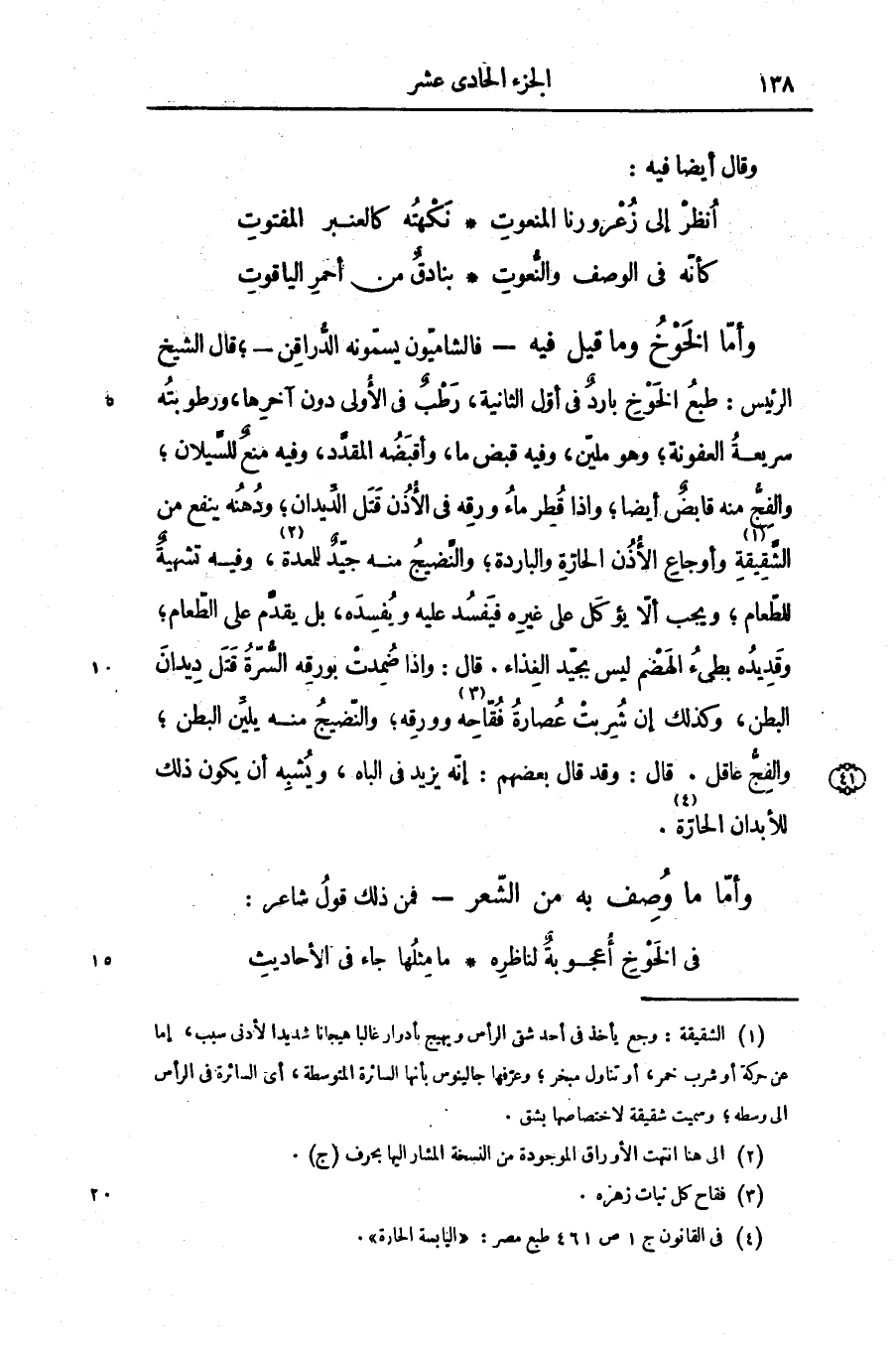 - فالشاميّون يسمّونه الدّراقن-؛ قال الشيخ الرئيس: طبع الخوخ بارد فى أوّل الثانية، رطب فى الأولى دون آخرها، ورطوبته سريعة العفونة؛ وهو مليّن، وفيه قبض ما، وأقبضه المقدّد، وفيه منع للسّيلان؛ والفجّ منه قابض أيضا؛ واذا قطر ماء ورقه فى الأذن قتل الدّيدان؛ ودهنه ينفع من الشّقيقة «1» وأوجاع الأذن الحارّة والباردة؛ والنّضيج منه جيّد للمعدة «2» ، وفيه تشهية للطّعام؛ ويجب ألّا يؤكل على غيره فيفسد عليه ويفسده، بل يقدّم على الطّعام؛ وقديده بطىء الهضم ليس بجيّد الغذاء. قال: واذا ضمدت بورقه السّرّة قتل ديدان البطن، وكذلك إن شربت عصارة فقّاحه «3» وورقه؛ والنّضيج منه يليّن البطن؛ والفجّ عاقل. قال: وقد قال بعضهم: إنّه يزيد فى الباه، ويشبه أن يكون ذلك للأبدان الحارّة «4» .