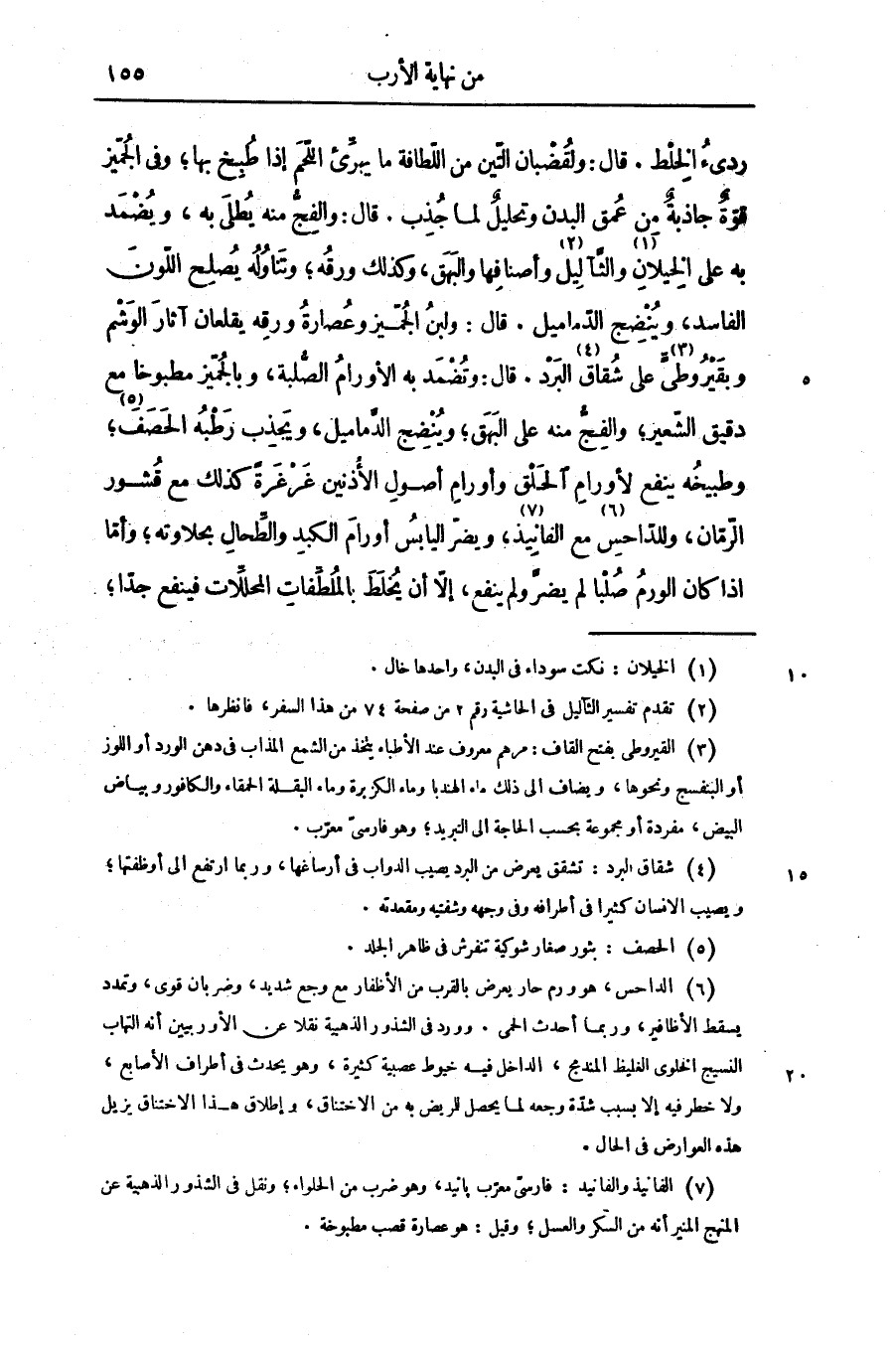 ردىء الخلط. قال: ولقضبان التّين من اللّطافة ما يهرّئ اللّحم إذا طبخ بها؛ وفى الجمّيز قوّة جاذبة من عمق البدن وتحليل لما جذب. قال: والفجّ منه يطلى به، ويضمد به على الخيلان «1» والثّآليل «2» وأصنافها والبهق، وكذلك ورقه؛ وتناوله يصلح اللّون الفاسد، وينضج الدّماميل. قال: ولبن الجمّيز وعصارة ورقه يقلعان آثار الوشم وبقيروطىّ «3» على شقاق «4» البرد. قال: وتضمد به الأورام الصّلبة، وبالجميّز مطبوخا مع دقيق الشّعير؛ والفجّ منه على البهق؛ وينضج الدّماميل، ويجذب رطبه الحصف «5» ؛ وطبيخه ينفع لأورام الحلق وأورام أصول الأذنين غرغرة كذلك مع قشور الرّمّان، وللدّاحس «6» مع الفانيذ «7» ، ويضرّ اليابس أورام الكبد والطّحال بحلاوته؛ وأمّا اذا كان الورم صلبا لم يضرّ ولم ينفع، إلّا أن يخلط بالملطّفات المحلّلات فينفع جدّا؛