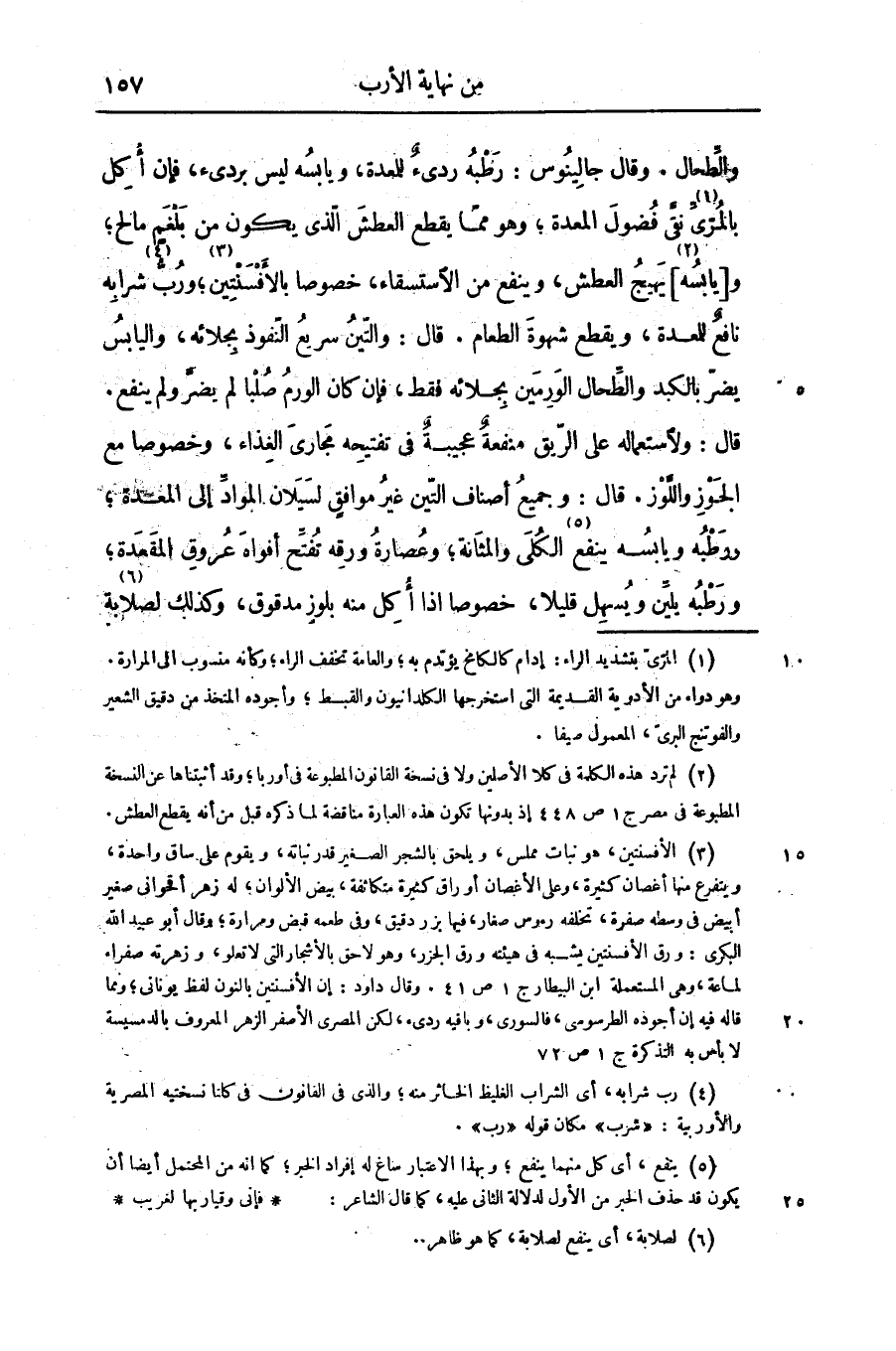 والطّحال. وقال جالينوس: رطبه ردىء للمعدة، ويابسه ليس بردىء، فإن أكل بالمرّىّ «1» نقىّ فضول المعدة؛ وهو ممّا يقطع العطش الّذى يكون من بلغم مالح؛ و [يابسه «2» ] يهيج العطش، وينفع من الاستسقاء، خصوصا بالأفسنتين «3» ؛ وربّ «4» شرابه نافع للمعدة، ويقطع شهوة الطعام. قال: والتّين سريع النّفوذ بجلائه، واليابس يضرّ بالكبد والطّحال الورمين بجلائه فقط، فإن كان الورم صلبا لم يضرّ ولم ينفع.