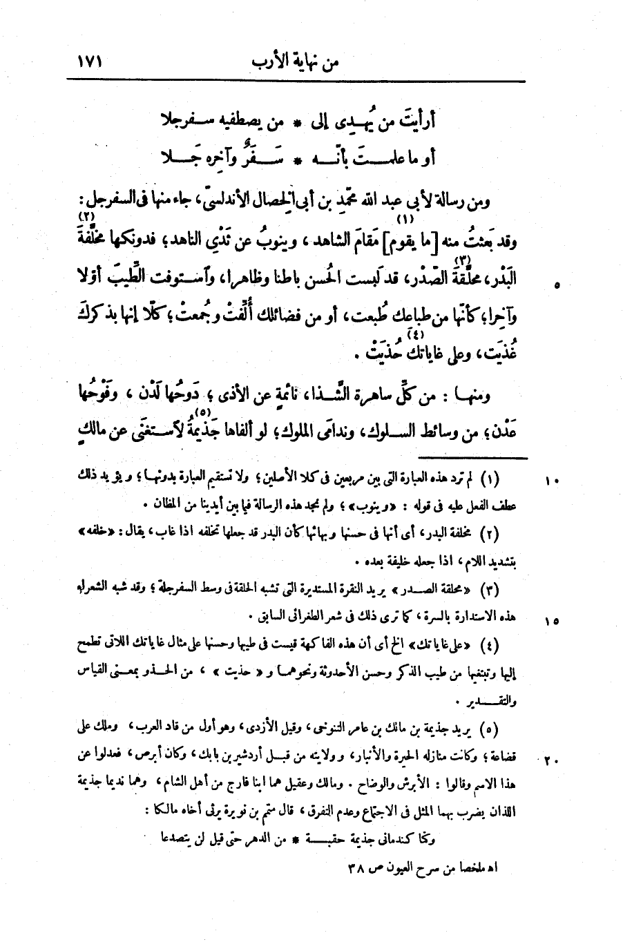 ومنها: من كلّ ساهرة الشّذا، نائمة عن الأذى؛ دوحها لدن، وفوحها عدن؛ من وسائط السلوك، وندامى الملوك؛ لو ألفاها جذيمة «5» لاستغنى عن مالك