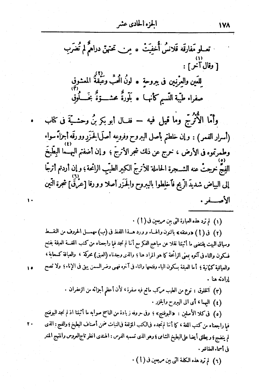 - فقال أبو بكر بن وحشيّة فى كتاب (أسرار القمر) : وإن خلطتم بأصل اليبروح وفروعه أصل الجزر وورقه أجزاء سواء وطمرتموه فى الأرض، خرج عن ذلك شجر الأترجّ، وإن أضفتم اليهما «4» البطّيخ الفجّ «5» خرجت عنه الشجرة الحاملة للأترجّ الكبير الطيّب الرائحة؛ وإن أردتم أترجّا إلى البياض شديد الرّيح فاخلطوا باليبروح والجزر أصلا وورقا [عرق «6» ] شجرة التّين الأصفر.