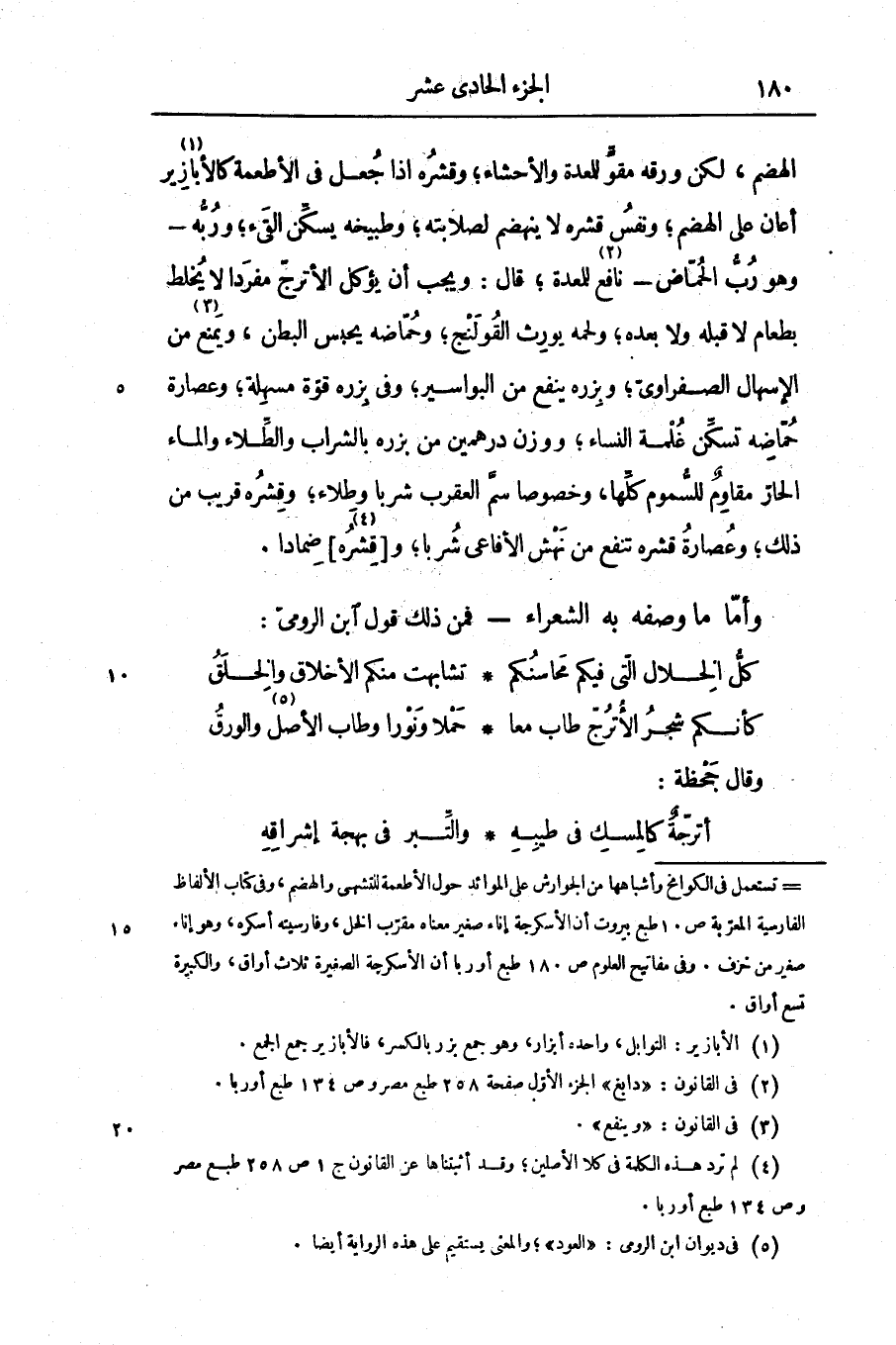 الهضم، لكن ورقه مقوّ للمعدة والأحشاء؛ وقشره اذا جعل فى الأطعمة كالأبازير «1» أعان على الهضم؛ ونفس قشره لا ينهضم لصلابته؛ وطبيخه يسكّن القىء؛ وربّه- وهو ربّ الحمّاض- نافع «2» للمعدة؛ قال: ويجب أن يؤكل الأترجّ مفردا لا يخلط بطعام لا قبله ولا بعده؛ ولحمه يورث القولنج؛ وحمّاضه يحبس البطن، ويمنع «3» من الإسهال الصفراوىّ؛ وبزره ينفع من البواسير؛ وفى بزره قوّة مسهلة؛ وعصارة حمّاضة تسكّن غلمة النساء؛ ووزن درهمين من بزره بالشراب والطّلاء والماء الحارّ مقاوم للسّموم كلّها، وخصوصا سمّ العقرب شربا وطلاء؛ وقشره قريب من ذلك؛ وعصارة قشره تنفع من نهش الأفاعى شربا؛ و [قشره «4» ] ضمادا.