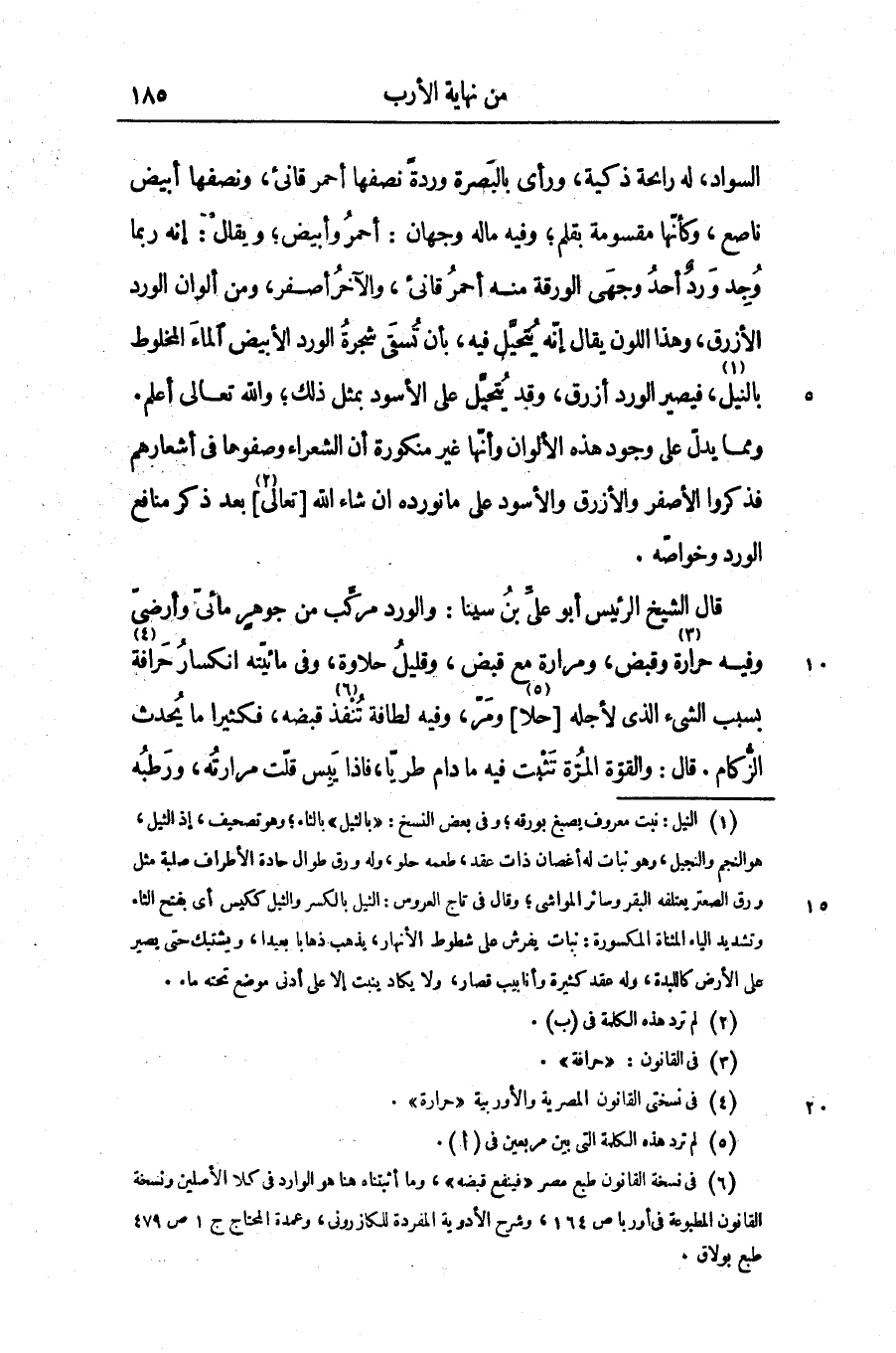 قال الشيخ الرئيس أبو علىّ بن سينا: والورد مركّب من جوهر مائىّ وأرضىّ وفيه حرارة «3» وقبض، ومرارة مع قبض، وقليل حلاوة، وفى مائيّته انكسار حرافة «4» بسبب الشىء الذى لأجله [حلا «5» ] ومرّ، وفيه لطافة تنفذ «6» قبضه، فكثيرا ما يحدث الزّكام. قال: والقوّة المرّة تثبت فيه مادام طريّا، فاذا يبس قلّت مرارته، ورطبه