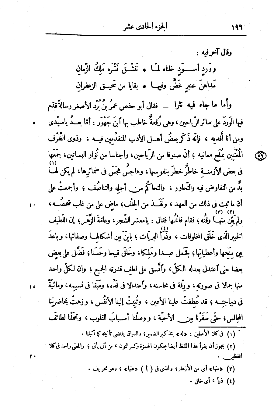 - فقال أبو حفص عمر بن برد الأصغر رسالة قدّم فيها الورد على سائر الرّياحين، وهى رقعة خاطب بها ابن جهور: أمّا بعد يا سيّدى ومن أنا أفديه، فإنّه ذكر بعض أهل الأدب المتقدّمين فيه، وذوى الظّرف المعتنين بملح معانيه؛ أنّ صنوفا من الرّياحين، وأجناسا من نوار البساتين، جمعها فى بعض الأزمنة خاطر خطر بنفوسها، وهاجس هجس فى ضمائرها، لم يكن لها «1» بدّ من التفاوض فيه والتّحاور، والتحاكم من أجله والتناصف؛ وأجمعت على أنّ ما ثبت فى ذلك من العهد، ونفذ من الحلف؛ ماض على من غاب شخصه، ولم يئن «2» منها «3» وقته؛ فقام قائمها فقال: يا معشر الشّجر، وعامّة الزّهر؛ إن اللّطيف الخبير الّذى خلق المخلوقات، وذرأ «4» البريّات؛ باين بين أشكالها وصفاتها، وباعد بين منحها وأعطياتها، فجعل عبدا وملكا، وخلق قبيحا وحسنا؛ فضّل على بعض بعضا حتى اعتدل بعدله الكلّ، واتّسق على لطف قدرته الجميع؛ وانّ لكلّ واحد منها جمالا فى صورته، ورقّة فى محاسنه، واعتدالا فى قدّه، وعبقا فى نسيمه، ومائيّة فى ديباجته؛ قد عطفت علينا الأعين، وثنيت إلينا الأنفس، وزهت بمحاضرتنا المجالس؛ حتّى سفرنا بين الأحبّة، ووصلنا أسباب القلوب، وتحمّلنا لطائف