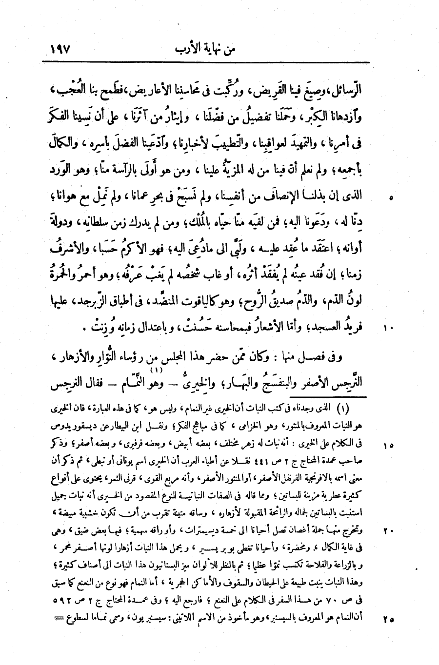 وفى فصل منها: وكان ممّن حضر هذا المجلس من رؤساء النّوّار والأزهار، النّرجس الأصفر والبنفسج والبهار؛ والخيرىّ- وهو «1» النّمّام- فقال النرجس