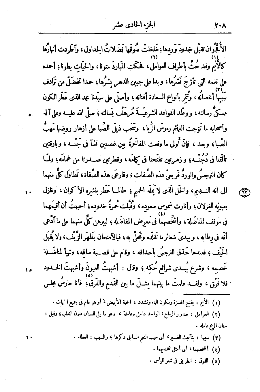 الأقحوان تقبّل خدود وردها؛ خلخلت سوقها فضلات الجداول، واطّردت أنهارها كالأيم «1» وقد حثّ بأطراف العوامل «2» ، فحكت المبارد متونا، والحيّات بطونا؛ أحمده على نعمه التى تأرّج نشرها، وبدا على جبين الدهر بشرها؛ حمدا تخضلّ من ترادف سيبها «3» أغصانه، وتثمر بأنواع السعادة أفنانه؛ وأصلّى على سيّدنا محمد الذى عطّر الكون مسكىّ رسالته، ووطّد القواعد الشرعيّة مرهف بسالته؛ صلّى الله عليه وعلى آله وأصحابه ما توّجت الغمائم رءوس الرّبا، وسحب ذيل الصّبا على أزهار روضها مهبّ الصّبا؛ وبعد، فإنّ أولى ما وقعت المفاخرة بين غصنين نشآ فى جنّه، وبارقتين تألّقتا فى دجنّه؛ وزهرتين تفتّحتا فى كمامه، وقطرتين صدرتا من غمامه؛ ولمّا كان النرجس والورد قريعى هذه الصّفات، وقارعى هذه الصّفاة، تطاول كلّ منهما الى انه النديم، والخلّ الّذى لا يملّه الحميم؛ طالما عطّر بنشره الأكوان، وغازل بعيونه الغزلان؛ وأنارت شموس سعوده، وقبّلت حمرة خدوده؛ أحببت أن أقيمهما فى موقف المناضلة، وأشخّصهما «4» فى معرض المفاضلة؛ ليبرهن كلّ منهما على ما ادّعى أنّه فى وطابه، ويبدى شعائر ما تقلّده وتحلّى به؛ فبالامتحان يظهر الزّيف، ولا يقبل الحيف؛ فعندها حدّق النرجس بأحداقه، وقام على قصبة ساقه؛ وتهيأ لمناضلة خصمه، وشرع يبدى شرائع حكمه؛ وقال: أشبهت العيون وأشبهت الخدود فلا فرق، ولقد علمت ما بينهما مثل ما بين القدم والفرق «5» ؛ فأنا حارس مجلس
