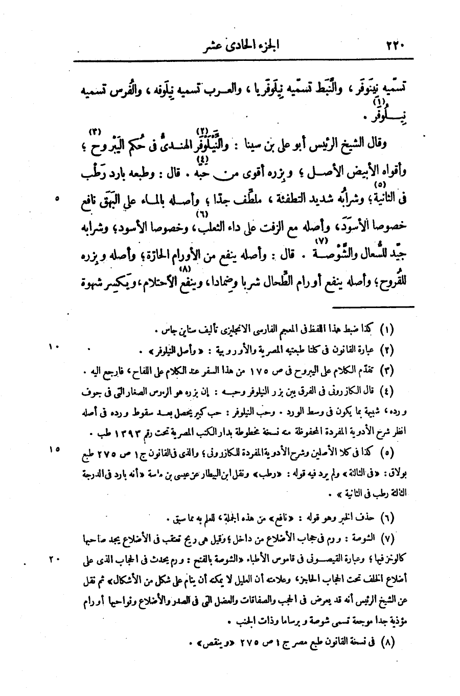 وقال الشيخ الرئيس أبو على بن سينا: والنّيلوفر «2» الهندىّ فى حكم اليبروح «3» ؛ وأقواه الأبيض الأصل؛ وبزره أقوى من حبّه «4» . قال: وطبعه بارد رطب فى الثانية «5» ؛ وشرابه شديد التطفئة، ملطّف جدّا، وأصله بالماء على البهق نافع خصوصا الأسود، وأصله مع الزفت على داء الثعلب «6» ، وخصوصا الأسود؛ وشرابه جيّد للسّعال والشّوصة «7» . قال: وأصله ينفع من الأورام الحارّة؛ وأصله وبزره للقروح؛ وأصله ينفع أورام الطّحال شربا وضمادا، وينفع «8» الاحتلام، ويكسر شهوة