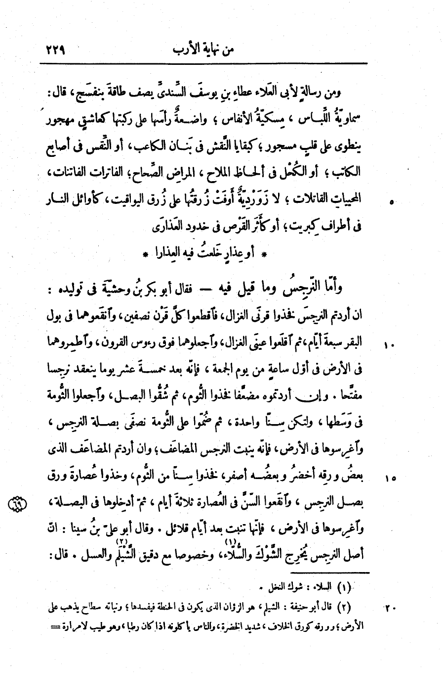 ان أردتم النرجس فخذوا قرنى الغزال، فاقطعوا كلّ قرن نصفين، وانقعوهما فى بول البقر سبعة أيّام، ثم اقلعوا عينى الغزال، واجعلوهما فوق رءوس القرون، واطمروهما فى الأرض فى أوّل ساعة من يوم الجمعة، فإنّه بعد خمسة عشر يوما ينعقد نرجسا مفتّحا. وإن أردتموه مضعّفا فخذوا الثّوم، ثم شقّوا البصل، واجعلوا الثّومة فى وسطها، ولتكن سنّا واحدة، ثم ضمّوا على الثّومة نصفى بصلة النرجس، واغرسوها فى الأرض، فإنّه ينبت النرجس المضاعف؛ وان أردتم المضاعف الذى بعض ورقه أخضر وبعضه أصفر، فخذوا سنّا من الثّوم، وخذوا عصارة ورق بصل النرجس، وانقعوا السّنّ فى العصارة ثلاثة أيام، ثمّ أدخلوها فى البصلة، واغرسوها فى الأرض، فإنّها تنبت بعد أيّام قلائل. وقال أبو علىّ بن سينا: انّ أصل النرجس يخرج الشّوك والسّلّاء «1» ، وخصوصا مع دقيق الشّيلم «2» والعسل. قال: