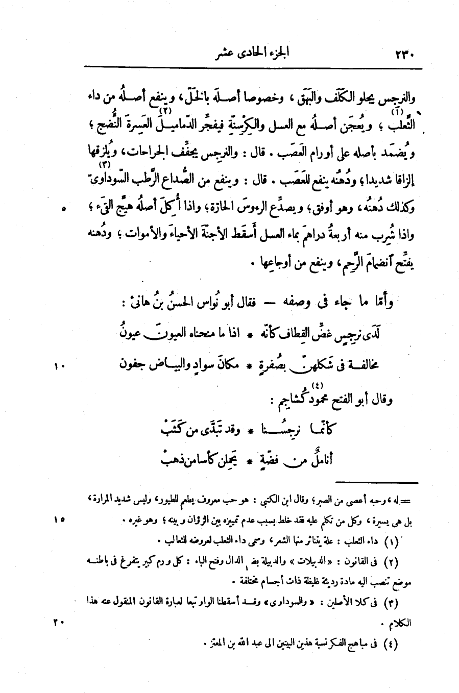 والنرجس يجلو الكلف والبهق، وخصوصا أصله بالخلّ، وينفع أصله من داء الثّعلب «1» ؛ ويعجن أصله مع العسل والكرسنّة فيفجّر الدّماميل «2» العسرة النّضج؛ ويضمد بأصله على أورام العصب. قال: والنرجس يجفّف الجراحات، ويلزقها إلزاقا شديدا؛ ودهنه ينفع للعصب. قال: وينفع من الصّداع الرّطب السّوداوىّ «3» وكذلك دهنه، وهو أوفق؛ ويصدّع الرءوس الحارّة؛ واذا أكل أصله هيّج القىء؛ واذا شرب منه أربعة دراهم بماء العسل أسقط الأجنّة الأحياء والأموات؛ ودهنه يفتّح انضمام الرّحم، وينفع من أوجاعها.