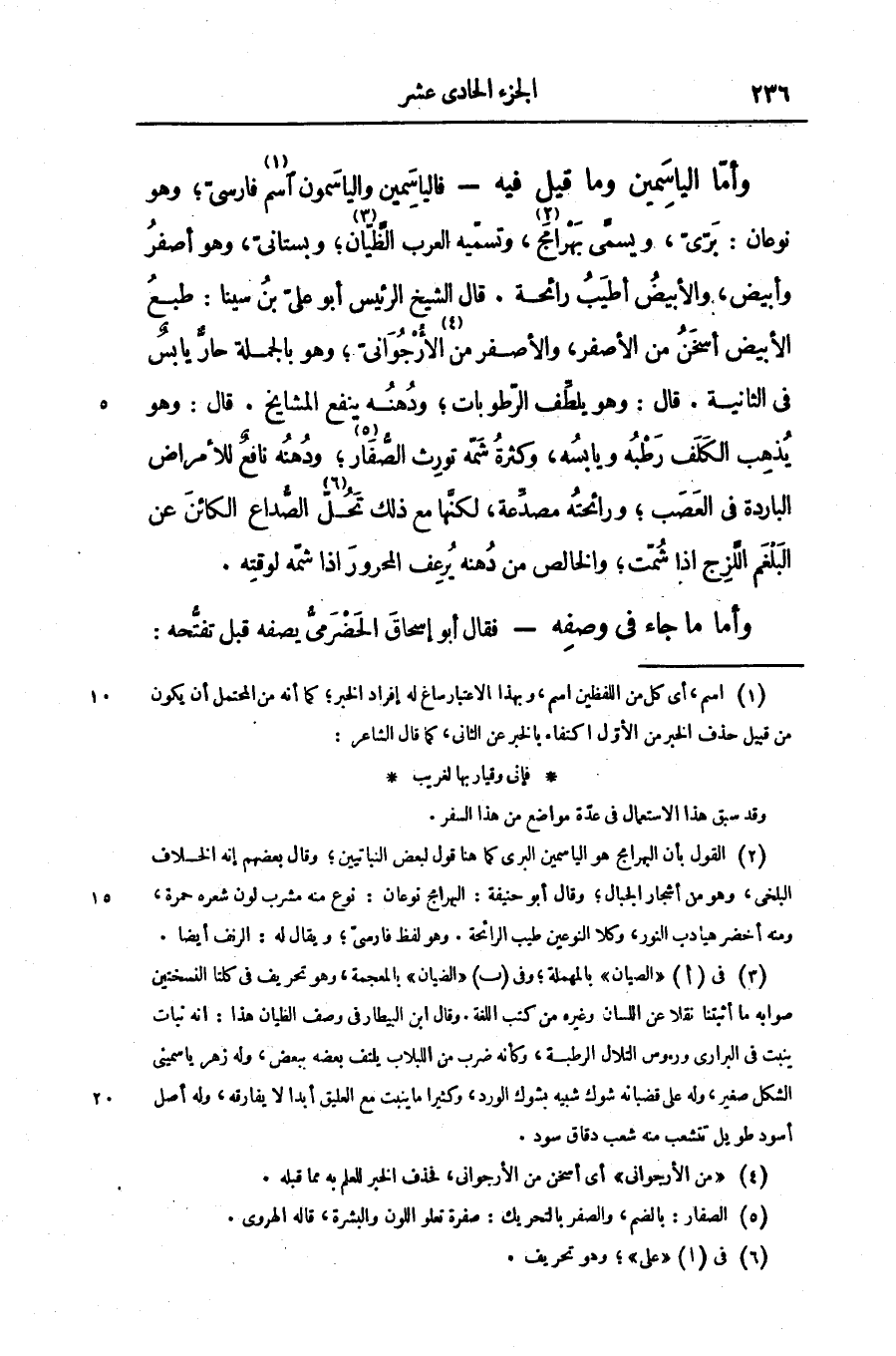 - فالياسمين والياسمون اسم «1» فارسىّ؛ وهو نوعان: برّىّ، ويسمّى بهرامج «2» ، وتسمّيه العرب الظّيّان «3» ؛ وبستانىّ، وهو أصفر وأبيض، والأبيض أطيب رائحة. قال الشيخ الرئيس أبو علىّ بن سينا: طبع الأبيض أسخن من الأصفر، والأصفر من «4» الأرجوانىّ؛ وهو بالجملة حارّ يابس فى الثانية. قال: وهو يلطّف الرّطوبات؛ ودهنه ينفع المشايخ. قال: وهو يذهب الكلف رطبه ويابسه، وكثرة شمّه تورث الصّفار «5» ؛ ودهنه نافع للأمراض الباردة فى العصب؛ ورائحته مصدّعة، لكنّها مع ذلك تحلّ «6» الصّداع الكائن عن البلغم اللّزج اذا شمّت؛ والخالص من دهنه يرعف المحرور اذا شمّه لوقته.