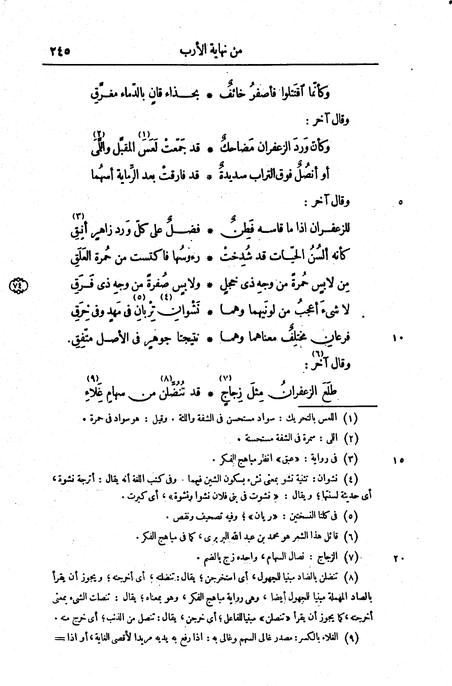 طلع الزعفران مثل زجاج «7» ... قد تنضّلن «8» من سهام غلاء «9»