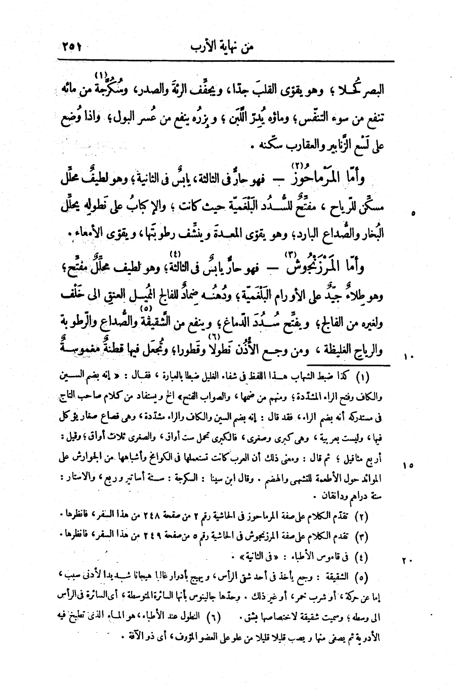 - فهو حارّ يابس فى الثالثة «4» ؛ وهو لطيف محلّل مفتّح؛ وهو طلاء جيّد على الأورام البلغميّة؛ ودهنه ضماد للفالج المميل العنق الى خلف ولغيره من الفالج؛ ويفتّح سدد الدّماغ؛ وينفع من الشّقيقة «5» والصّداع والرّطوبة والرياح الغليظة، ومن وجع الأذن نطولا «6» وقطورا؛ وتجعل فيها قطنة مغموسة