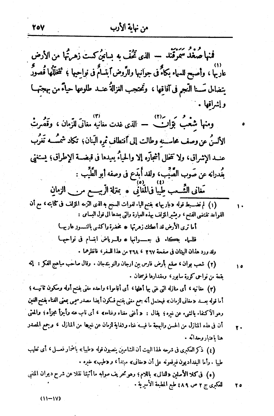 - الذى غدت مغانيه «3» مغانى للزّمان، وقصرت الألسن عن وصف محاسنه وطالت إلى اقتطاف ثمره البنان؛ تكاد شمسه تغرب عند الإشراق، ولا تتخلل أشجاره إلا والحياء يعيدها فى قبضة الإطراق؛ يستغنى بغدرانه عن صوب الصّيّب، ولقد أبدع فى وصفه أبو الطّيّب: