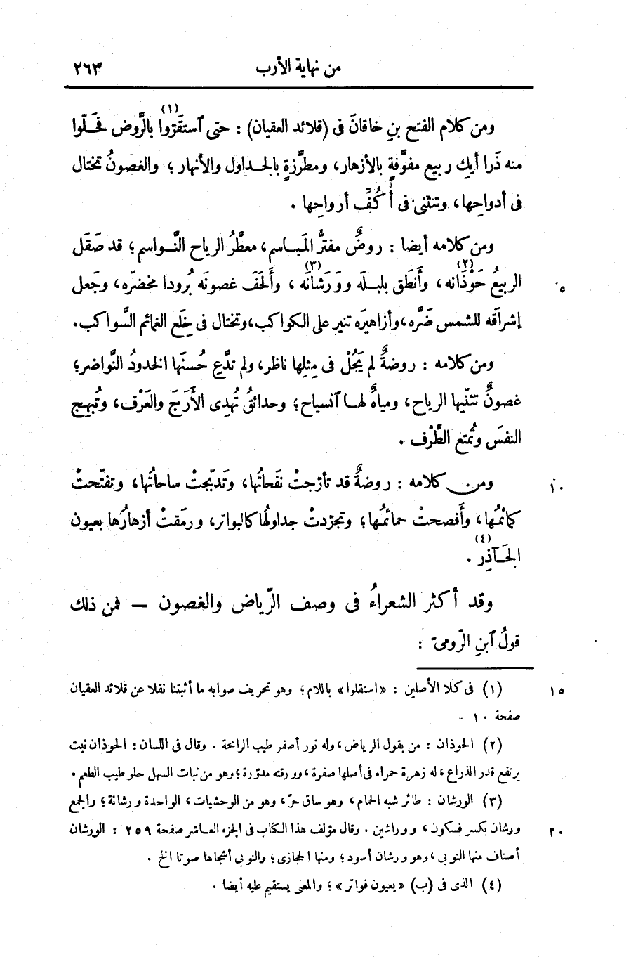 ومن كلام الفتح بن خاقان فى (قلائد العقيان) : حتى استقرّوا «1» بالرّوض فحلّوا منه ذرا أيك ربيع مفوّفة بالأزهار، ومطرّزة بالجداول والأنهار؛ والغصون تختال فى أدواحها، وتنثنى فى أكفّ أرواحها.
