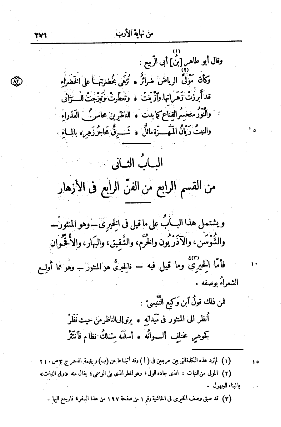 ويشتمل هذا الباب على ما قيل فى الخيرى- وهو المنثور- والسّوسن، والآذريون والخرّم، والشّقيق، والبهار، والأقحوان