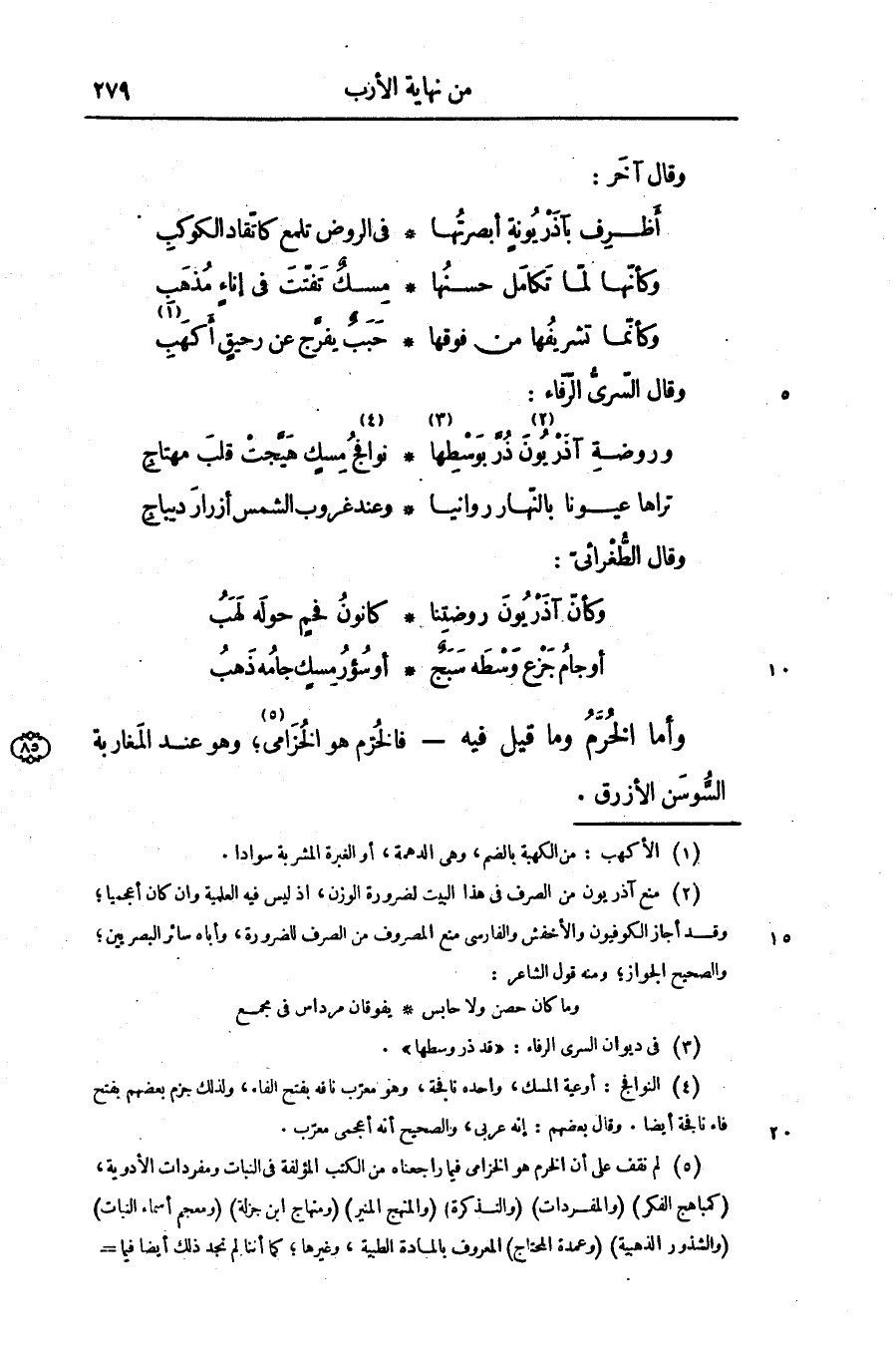 وروضة آذريون «2» ذرّ بوسطها «3» ... نوافج «4» مسك هيّجت قلب مهتاج