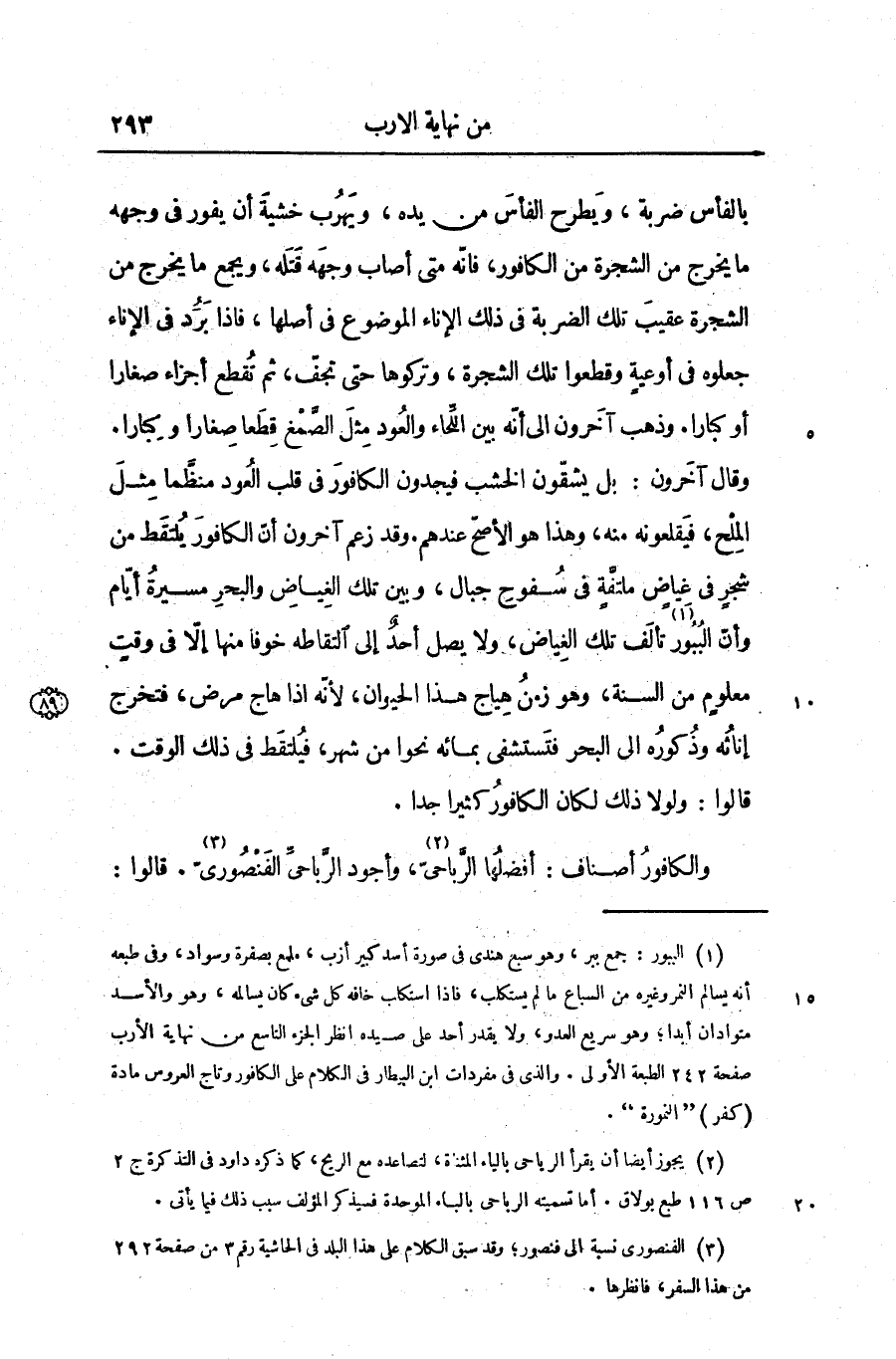 وقال آخرون: بل يشقّون الخشب فيجدون الكافور فى قلب العود منظّما مثل الملح، فيقلعونه منه، وهذا هو الأصحّ عندهم. وقد زعم آخرون أنّ الكافور يلتقط من شجر فى غياض ملتفّة فى سفوح جبال، وبين تلك الغياض والبحر مسيرة أيّام وأنّ الببور «1» تألف تلك الغياض، ولا يصل أحد إلى التقاطه خوفا منها إلّا فى وقت معلوم من السنة، وهو زمن هياج هذا الحيوان، لأنّه اذا هاج مرض، فتخرج إناثه وذكوره الى البحر فتستشفى بمائه نحوا من شهر، فيلتقط فى ذلك الوقت.