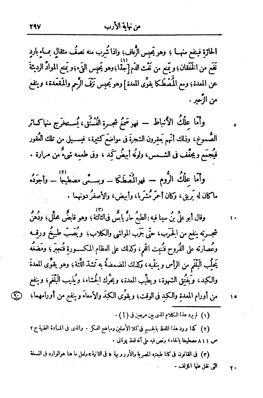 وقال أبو علىّ بن سينا فيه: الطبع حارّ يابس فى الثالثة «3» ؛ وهو قابض محلّل؛ ودهن شجرته ينفع من الجرب، حتّى جرب المواشى والكلاب؛ ويصبّ طبيخ ورقه وعصارته على القروح فتنبت اللّحم، وكذلك على العظام المكسورة فتجبر؛ ومضغه يحلب البلغم من الرأس وينقّيه، وكذلك المضمضة به تشدّ اللّثة؛ وهو يقوّى المعدة والكبد، ويفتق الشهوة، ويطّيب المعدة، ويحرّك الجشاء، ويذيب البلغم؛ وينفع والكبد، ويفتق الشهوة، ويطيّب المعدة، ويحرّك الجشاء، ويذيب البلغم؛ وينفع من أورام المعدة والكبد فى الوقت؛ ويقوّى الكبد والأمعاء وينفع من أورامهما؛