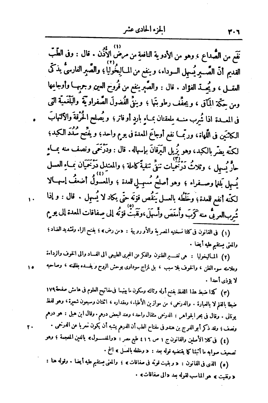 نفع من الصّداع، وهو من الأدوية النافعة من مرض «1» الأذن. قال: وفى الطّبّ القديم أنّ الصّبر يسهل السوداء، وينفع من الماليخوليا «2» ؛ والصّبر الفارسىّ يذكىّ العقل، ويحدّ الفؤاد. قال: والصّبر ينفع من قروح العين وجربها وأوجاعها ومن حكّة المآقى، ويجفّف رطوبتها؛ وينقّى الفضول الصّفراويّة والبلغميّة التى فى المعدة اذا شرب منه ملعقتان بماء بارد أو فاتر؛ ويصلح الحرقة والالتهاب الكائنين فى اللهاة، وربّما نفع أوجاع المعدة فى يوم واحد؛ ويفتّح سدد الكبد؛ لكنّه يضرّ بالكبد، وهو يزيل اليرقان بإسهاله. قال: ودرخمى ونصف منه بماء حارّ يسهل، وثلاث درخميات «3» تنقّى تنقية كاملة؛ والمعتدل درخميان بماء العسل يسهل بلغما وصفراء؛ وهو أصلح مسهل للمعدة؛ والمعسول «4» أضعف إسهالا لكنّه أنفع للمعدة؛ وخلطه بالعسل ينقص قوّته حتّى يكاد لا يسهل. قال: وإذا شرب العربىّ منه كرب وأمغص وأسهل، ونقبت «5» قوّته إلى صفاقات المعدة إلى يوم