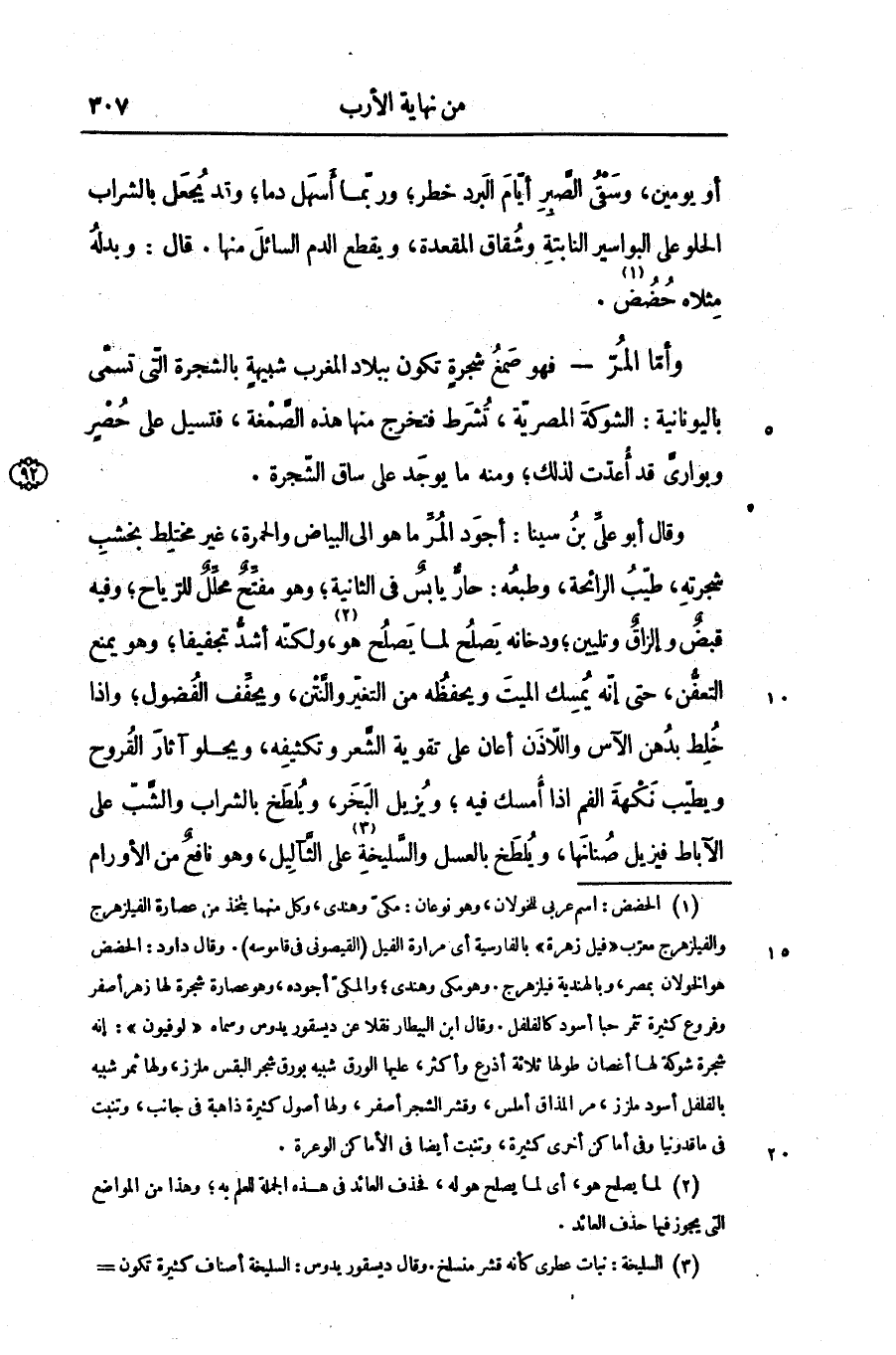 وقال أبو علىّ بن سينا: أجود المرّ ما هو الى البياض والحمرة، غير مختلط بخشب شجرته، طيّب الرائحة، وطبعه: حارّ يابس فى الثانية؛ وهو مفتّح محلّل للرّياح؛ وفيه قبض وإلزاق وتليين؛ ودخانه يصلح لما يصلح هو «2» ، ولكنّه أشدّ تجفيفا؛ وهو يمنع التعفّن، حتى إنّه يمسك الميت ويحفظه من التغيّر والنّتن، ويجفّف الفضول؛ واذا خلط بدهن الآس واللّاذن أعان على تقوية الشّعر وتكثيفه، ويجلو آثار القروح ويطيّب نكهة الفم اذا أمسك فيه؛ ويزيل البخر، ويلطخ بالشراب والشّبّ على الآباط فيزيل صنانها، ويلطخ بالعسل والسّليخة «3» على الثّآليل، وهو نافع من الأورام