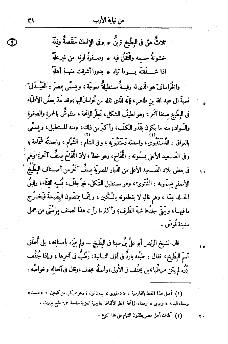 قال الشيخ الرئيس أبو علىّ بن سينا فى البطّيخ- ولم يميّزه بأصنافه، بل أطلق اسم البطّيخ، فقال: طبعه بارد فى أوّل الثانية، رطب فى آخرها؛ وإذا جفّف بزره لم يكن مرطّبا، بل يجفّف فى الأولى، وأصله مجفف، وقال فى أفعاله وخواصّه: