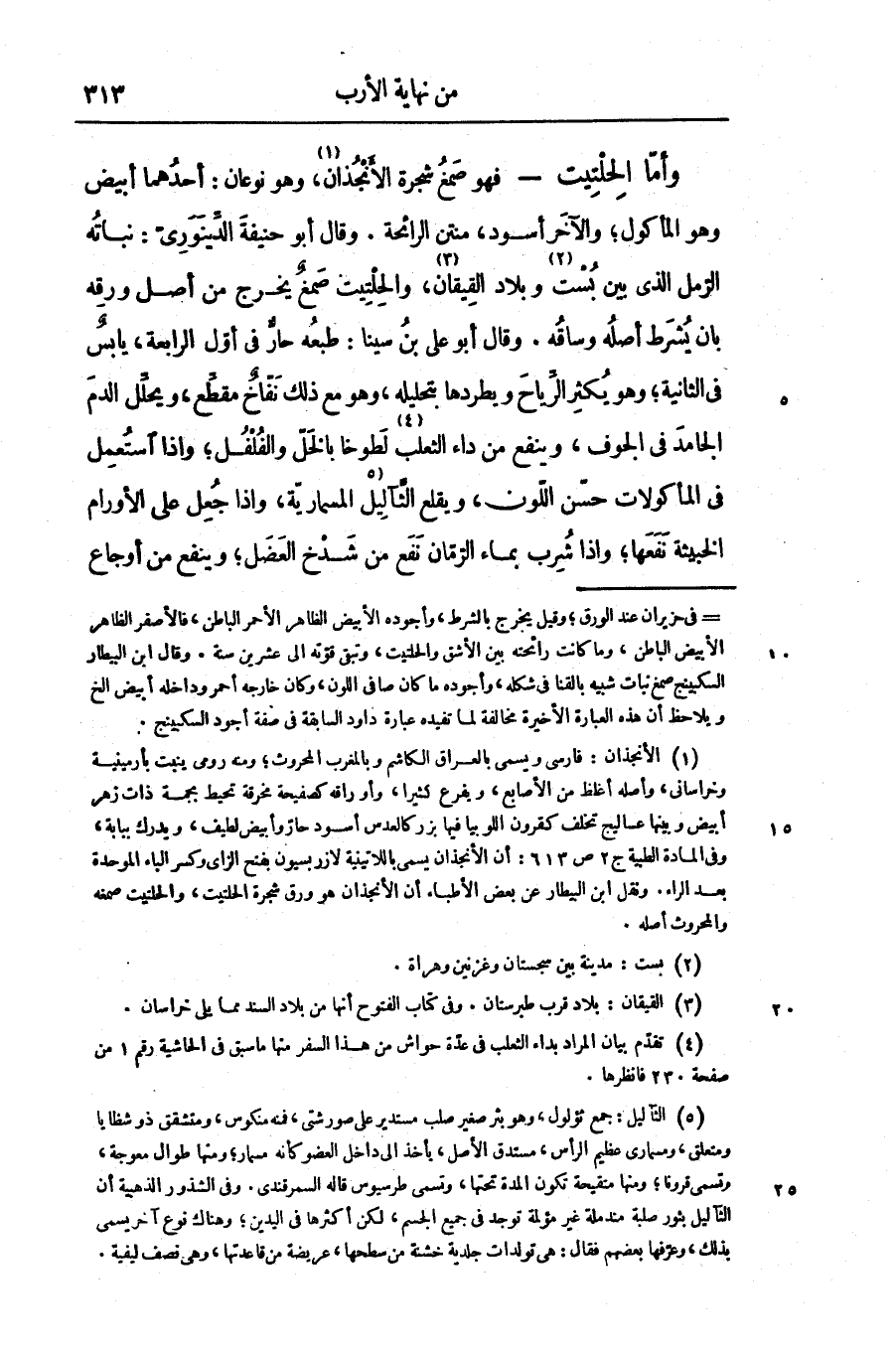 - فهو صمغ شجرة الأنجذان «1» ، وهو نوعان: أحدهما أبيض وهو المأكول؛ والآخر أسود، منتن الرائحة. وقال أبو حنيفة الدّينورىّ: نباته الرّمل الذى بين بست «2» وبلاد القيقان «3» ، والحلتيت صمغ يخرج من أصل ورقه بان يشرط أصله وساقه. وقال أبو على بن سينا: طبعه حارّ فى أوّل الرابعة، يابس فى الثانية؛ وهو يكثر الرّياح ويطردها بتحليله، وهو مع ذلك نفّاخ مقطّع، ويحلّل الدم الجامد فى الجوف، وينفع من داء الثعلب «4» لطوخا بالخلّ والفلفل؛ واذا استعمل فى المأكولات حسّن اللّون، ويقلع الثّآليل «5» المسماريّة، واذا جعل على الأورام الخبيثة نفعها؛ واذا شرب بماء الرّمّان نفع من شدخ العضل؛ وينفع من أوجاع