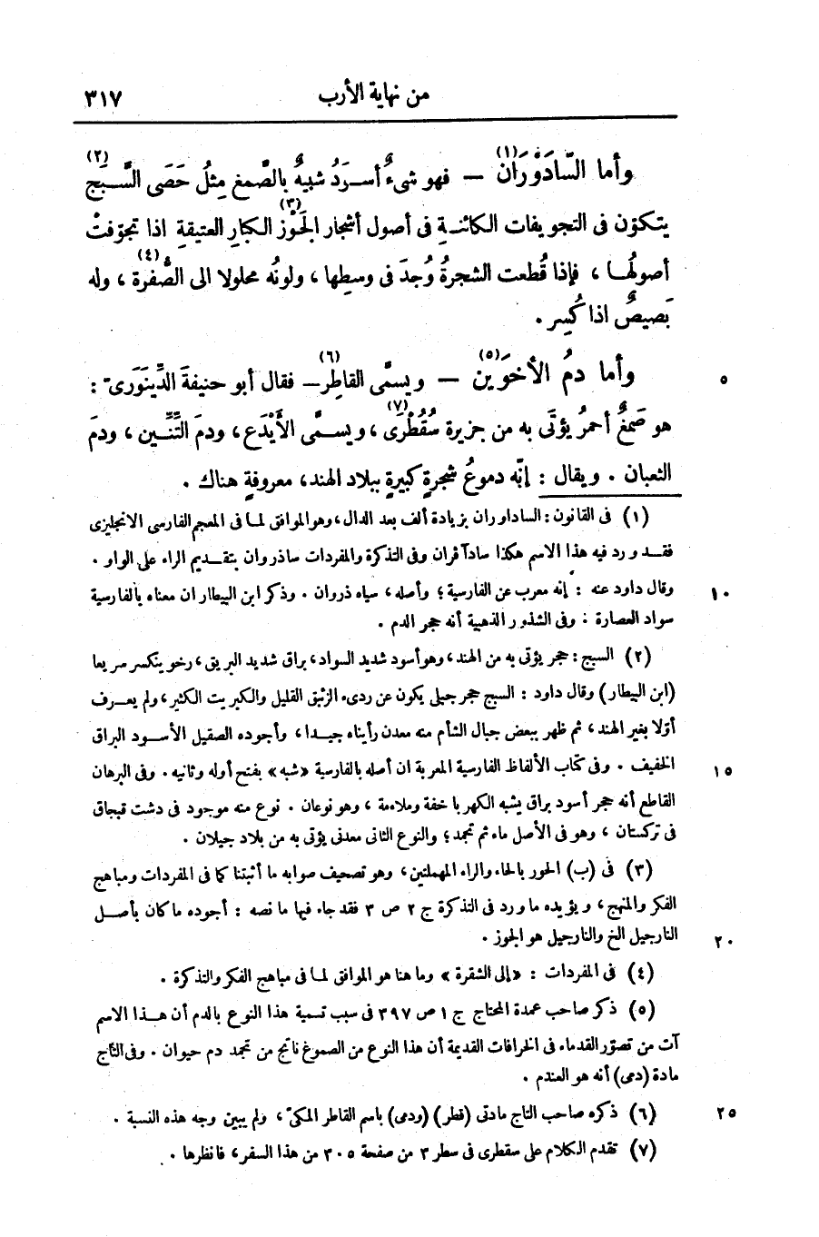 - فهو شىء أسود شبيه بالصّمغ مثل حصى السّبج «2» يتكوّن فى التجويفات الكائنة فى أصول أشجار الجوز «3» الكبار العتيقة اذا تجوّفت أصولها، فإذا قطعت الشجرة وجد فى وسطها، ولونه محلولا الى الصّفرة «4» ، وله بصيص اذا كسر.