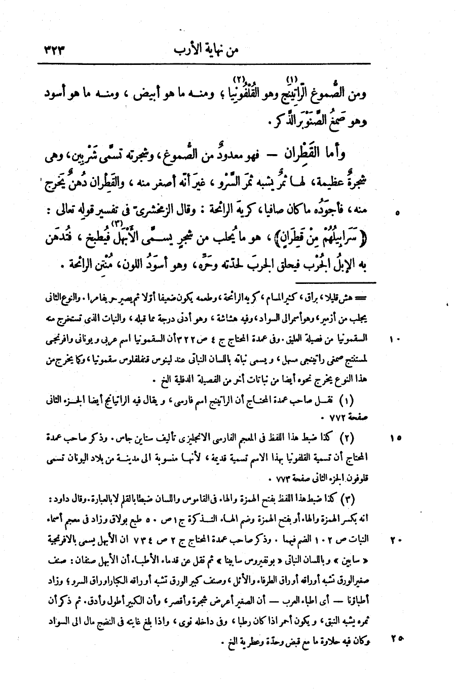 - فهو معدود من الصّموغ، وشجرته تسمّى شربين، وهى شجرة عظيمة، لها ثمر يشبه ثمر السّرو، غير أنّه أصغر منه، والقطران دهن يخرج منه، فأجوده ما كان صافيا، كريه الرائحة: وقال الزمخشرىّ فى تفسير قوله تعالى: