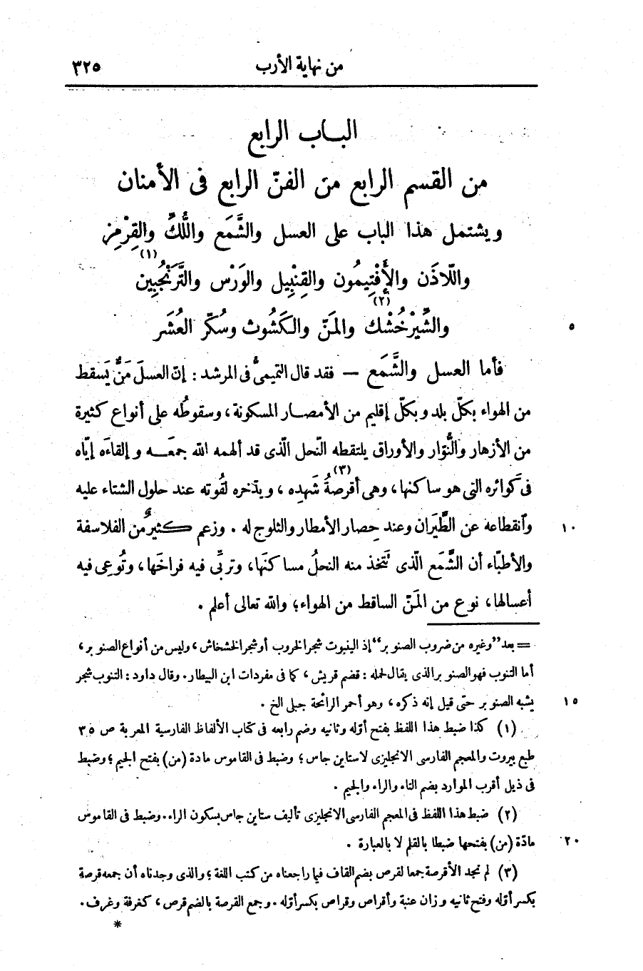 ويشتمل هذا الباب على العسل والشّمع واللّكّ والقرمز واللّاذن والأفتيمون والقنبيل والورس والتّرنجبين «1» والشّيرخشك «2» والمنّ والكشوث وسكّر العشر