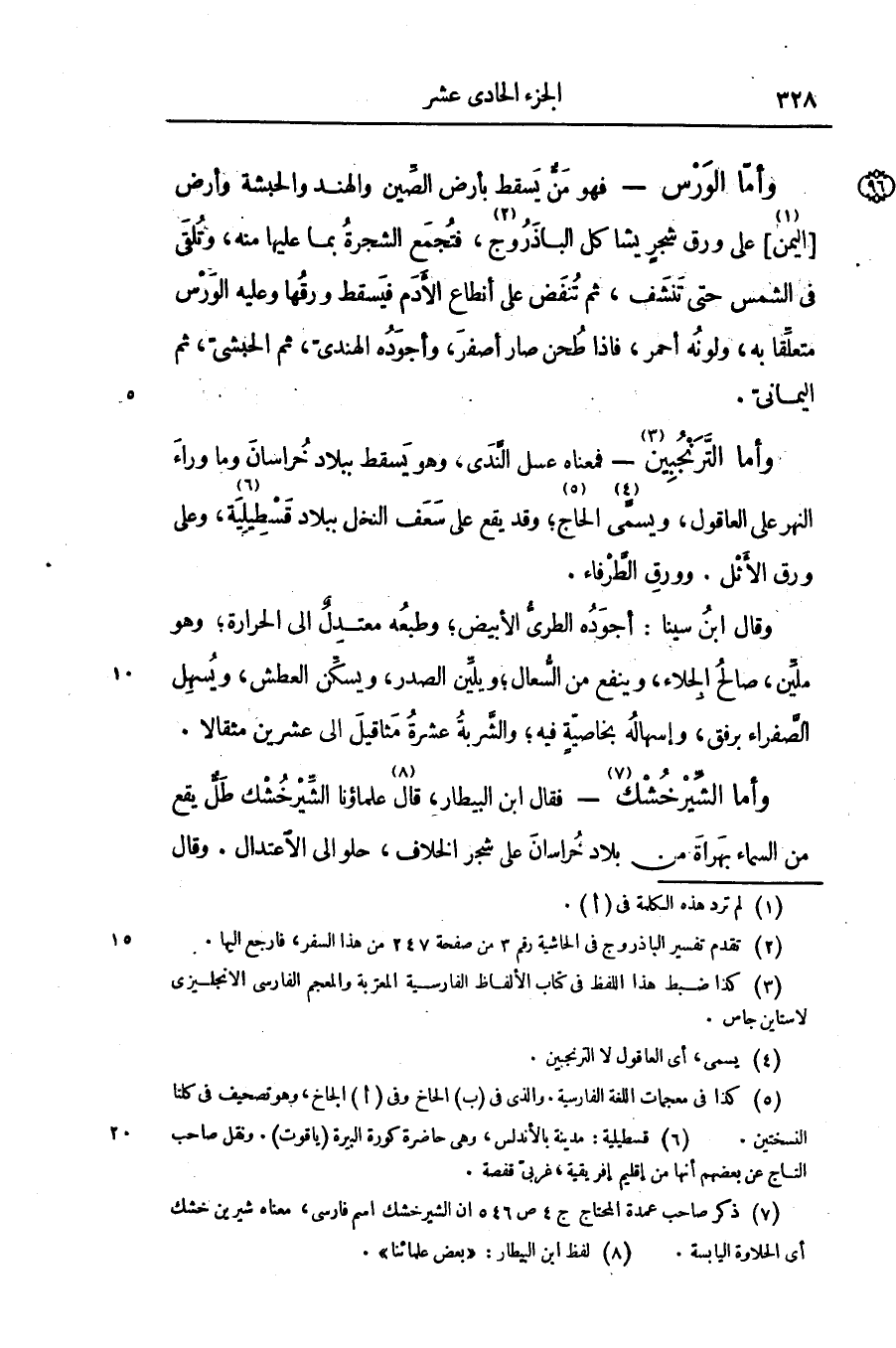 «7» - فقال ابن البيطار، قال «8» علماؤنا الشّير خشك طلّ يقع من السماء بهراة من بلاد خراسان على شجر الخلاف، حلو الى الاعتدال. وقال