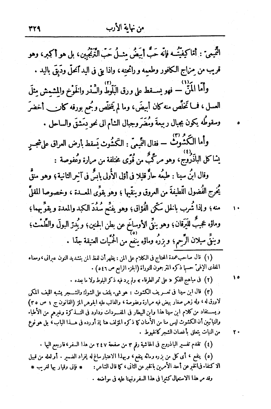 «1» - فهو يسقط على ورق البلّوط «2» والسّدر والخوخ والمشمش مثل العسل، فما تخلّص منه كان أبيض، وما لم يتخلّص وجمع بورقه كان أخضر وسقوطه يكون بجبال ربيعة ومضر وجبال الشأم الى نحو دمشق والساحل.
