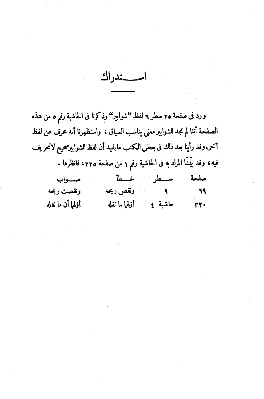 ورد فى صفحة 25 سطر 6 لفظ «شوابير» وذكرنا فى الحاشية رقم 5 من هذه الصفحة أننا لم نجد للشوابير معنى يناسب السياق، واستظهرنا أنه محرف عن لفظ آخر. وقد رأينا بعد ذلك فى بعض الكتب ما يفيد أن لفظ الشوابير صحيح لا تحريف فيه، وقد بيّنّا المراد به فى الحاشية رقم 1 من صفحة 225، فانظرها.