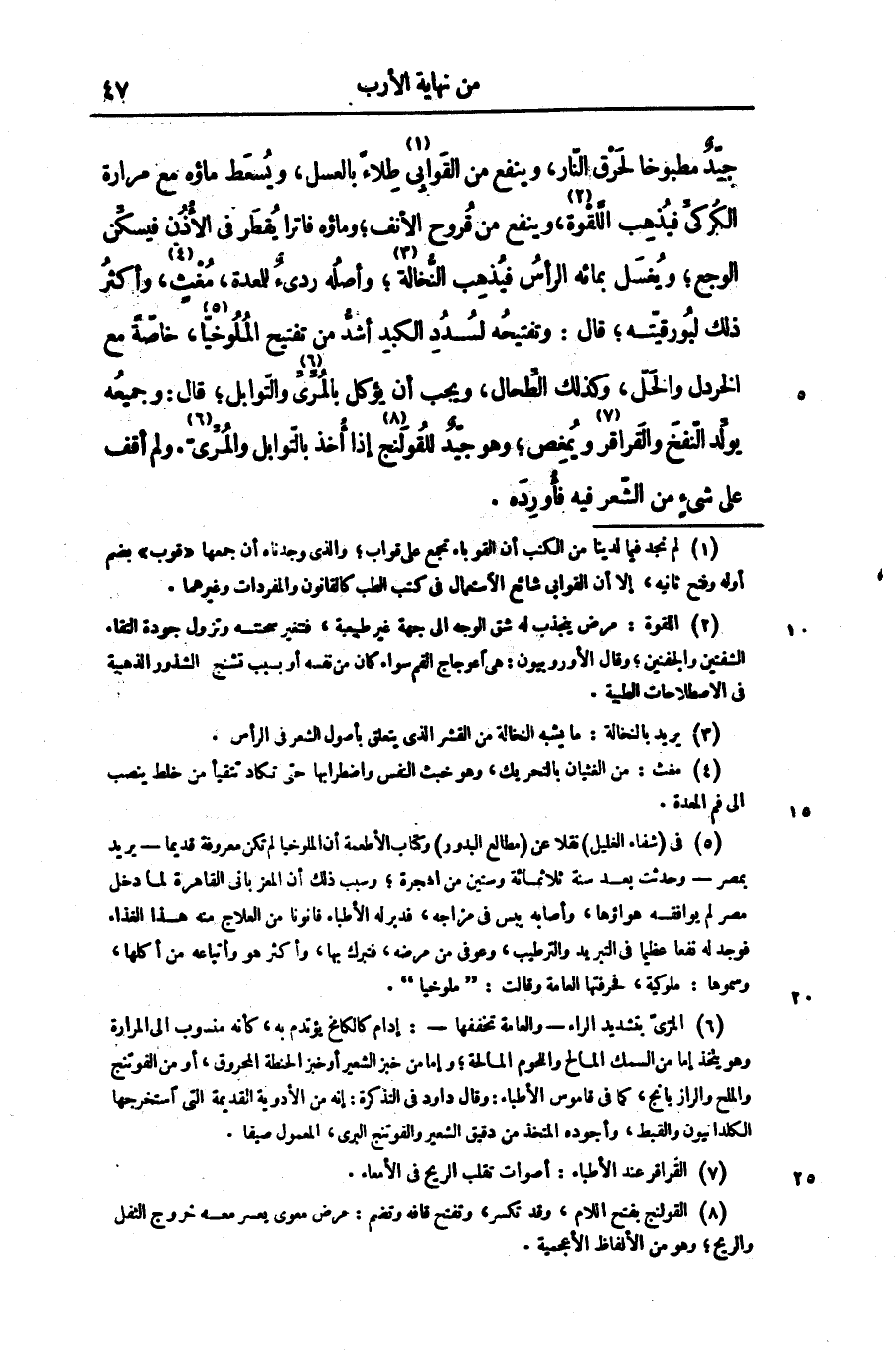 جيّد مطبوخا لحرق النّار، وينفع من القوابى «1» طلاء بالعسل، ويسعط ماؤه مع مرارة الكركىّ فيذهب اللّقوة «2» ، وينفع من قروح الأنف؛ وماؤه فاترا يقطر فى الأذن فيسكّن الوجع؛ ويغسل بمائه الرأس فيذهب النّخالة «3» ؛ وأصله ردىء للمعدة، مغث «4» ، وأكثر ذلك لبورقيّته؛ قال: وتفتيحه لسدد الكبد أشدّ من تفتيح الملوخيّا «5» ، خاصّة مع الخردل والخلّ، وكذلك الطّحال، ويجب أن يؤكل بالمرّىّ «6» والتّوابل؛ قال: وجميعه يولّد النّفخ والقراقر «7» ويمغص؛ وهو جيّد للقولنج «8» إذا أخذ بالّتوابل والمرّىّ. ولم أقف على شىء من الشّعر فيه فأورده.