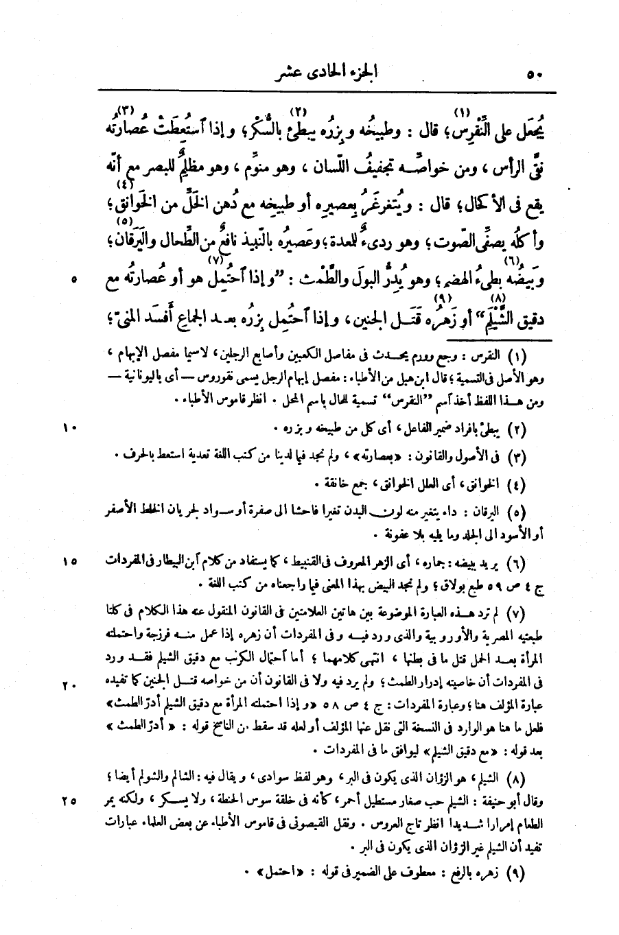 يجعل على النّقرس «1» ؛ قال: وطبيخه وبزره يبطىء «2» بالسّكر؛ وإذا استعطت عصارته «3» نقّى الرأس، ومن خواصّه تجفيف اللّسان، وهو منوّم، وهو مظلم للبصر مع أنّه يقع فى الأكحال؛ قال: ويتغرغر بعصيره أو طبيخه مع دهن الخلّ من الخوانق «4» ؛ وأكله يصفّى الصّوت؛ وهو ردىء للمعدة؛ وعصيره بالنّبيذ نافع من الطّحال واليرقان «5» ؛ وبيضه «6» بطىء الهضم؛ وهو يدرّ البول والطّمث: «وإذا احتمل «7» هو أو عصارته مع دقيق الشّيلم «8» » أو زهره «9» قتل الجنين، وإذا احتمل بزره بعد الجماع أفسد المنىّ؛