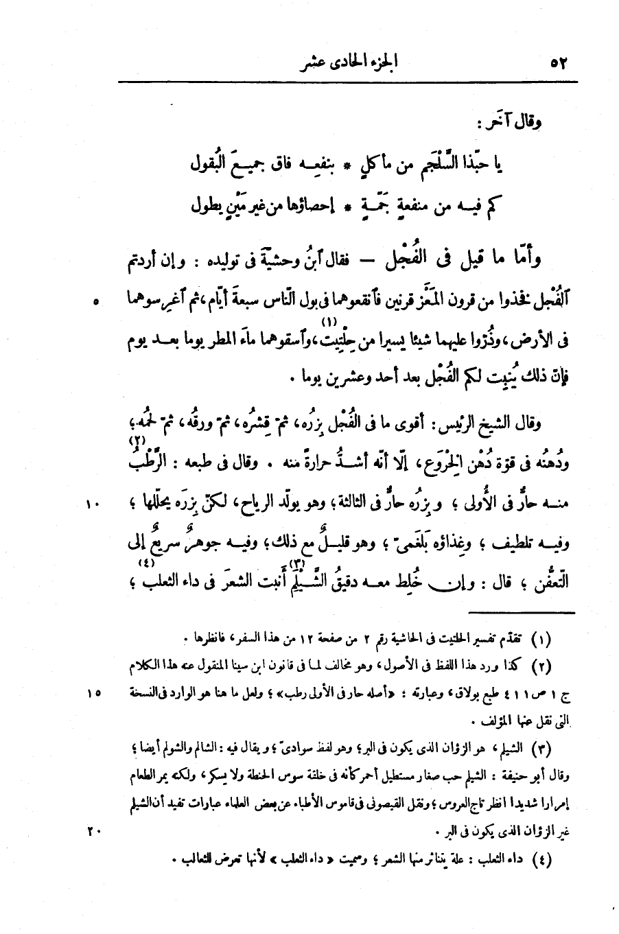 وقال الشيخ الرئيس: أقوى ما فى الفجل بزره، ثمّ قشره، ثمّ ورقه، ثمّ لحمه؛ ودهنه فى قوّة دهن الخروع، إلّا أنّه أشدّ حرارة منه. وقال فى طبعه: الرّطب «2» منه حارّ فى الأولى؛ وبزره حارّ فى الثالثة؛ وهو يولّد الرياح، لكنّ بزره يحلّلها؛ وفيه تلطيف؛ وغذاؤه بلغمىّ؛ وهو قليل مع ذلك؛ وفيه جوهر سريع إلى التّعفّن؛ قال: وإن خلط معه دقيق الشّيلم «3» أنبت الشعر فى داء الثعلب «4» ؛