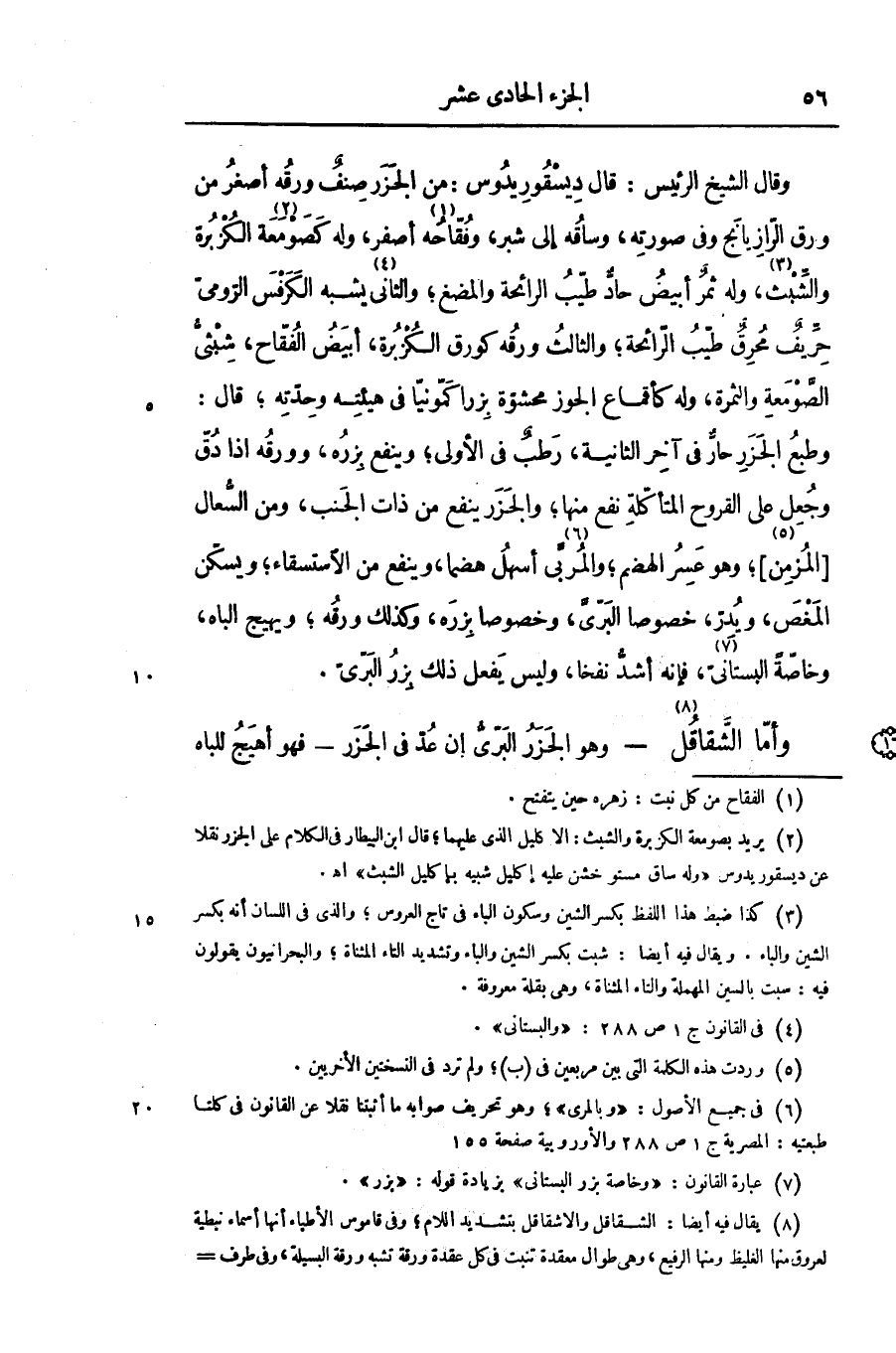 وقال الشيخ الرئيس: قال ديسقور يدوس: من الجزر صنف ورقه أصغر من ورق الرّازيانج وفى صورته، وساقه إلى شبر، وفقّاحه «1» أصفر، وله كصومعة «2» الكزبرة والشّبث «3» ، وله ثمر أبيض حادّ طيّب الرائحة والمضغ؛ والثانى «4» يشبه الكرفس الرّومىّ حرّيف محرق طيّب الرّائحة؛ والثالث ورقه كورق الكزبرة، أبيض الفقّاح، شبثىّ الصّومعة والثمرة، وله كأقماع الجوز محشوّة بزرا كمّونيّا فى هيئته وحدّته؛ قال: