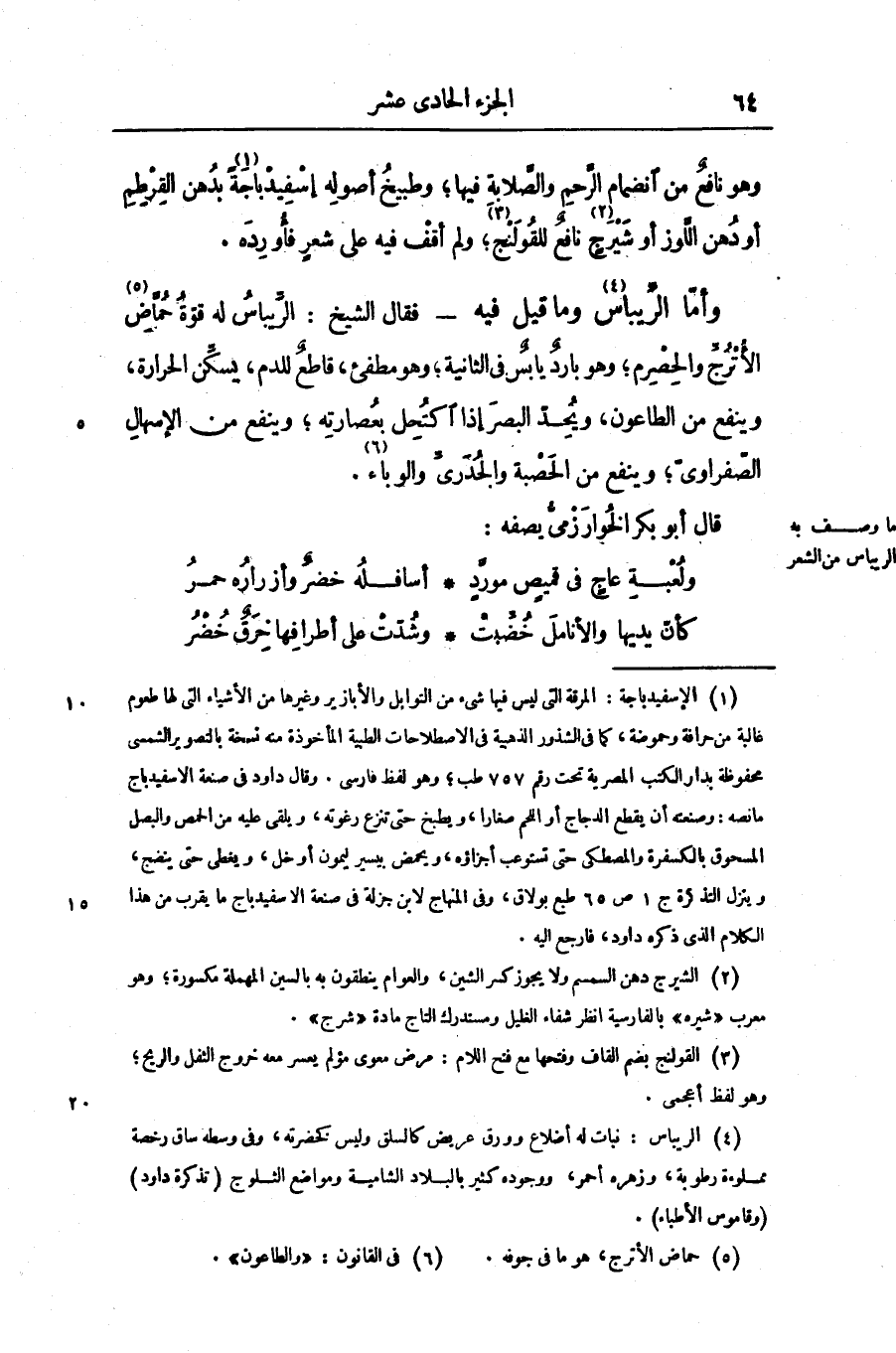 وهو نافع من انضمام الرّحم والصّلابة فيها؛ وطبيخ أصوله إسفيد باجة «1» بدهن القرطم أو دهن اللّوز أو شيرج «2» نافع للقولنج «3» ؛ ولم أقف فيه على شعر فأورده.