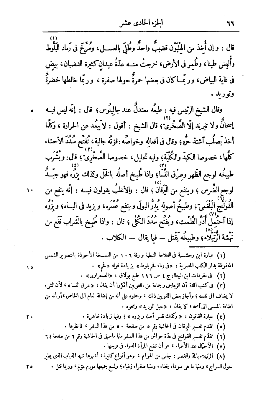 قال: وإن أخذ من الهليون قضيب واحد وطلى بالعسل، ومرّغ فى رماد البلّوط «1» وألبس طينا، وطمر فى الأرض، خرجت منه عدّة عيدان كثيرة القضبان، بيض فى غاية البياض، وربّما كان فى بعضها حمرة حولها صفرة، وربّما كان فى بعضها حمرة حولها صفرة، وربمّا خالطها خضرة وتوريد.