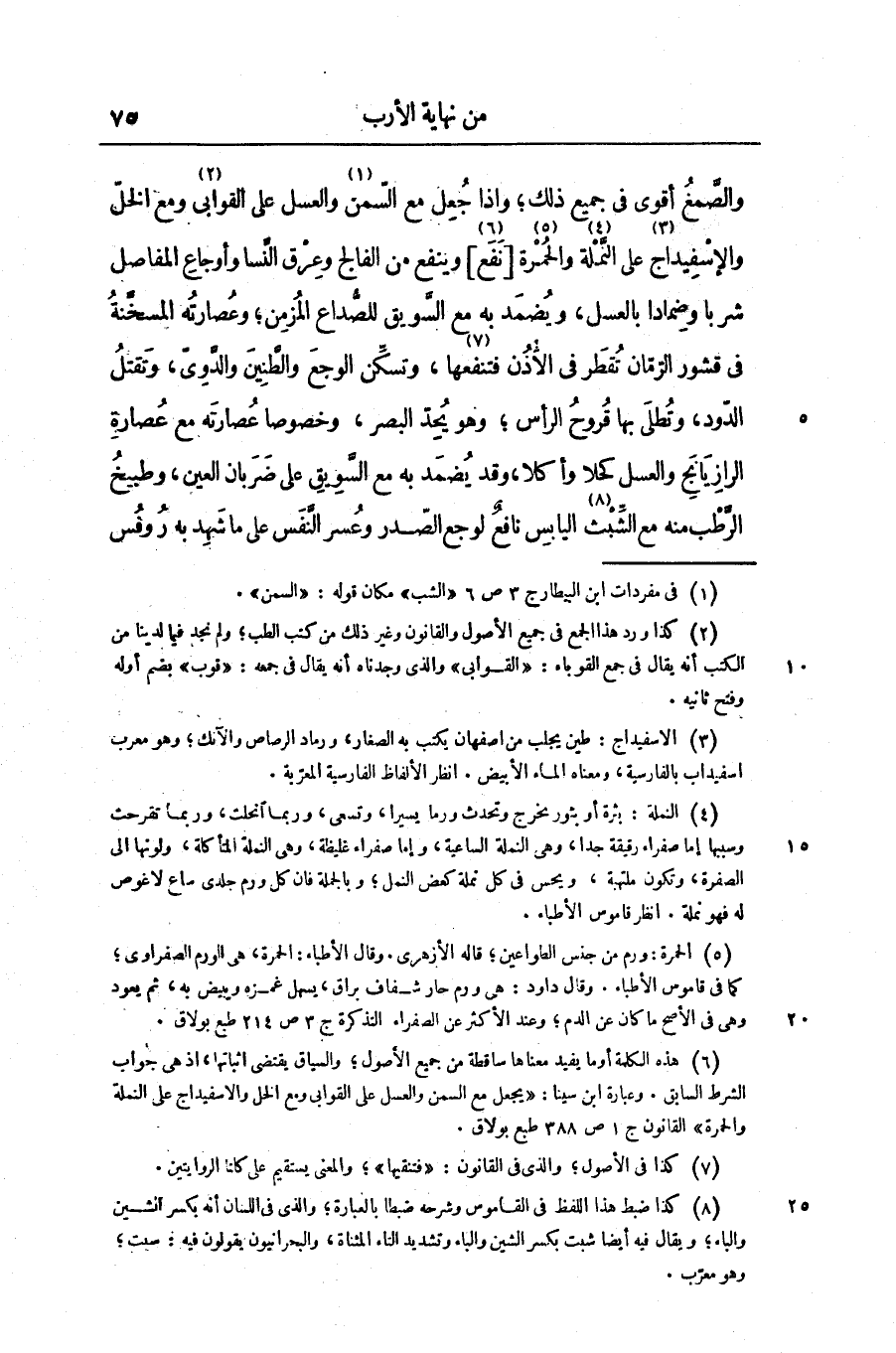 والصّمغ أقوى فى جميع ذلك؛ واذا جعل مع السّمن «1» والعسل على القوابى «2» ومع الخلّ والإسفيداج «3» على النّملة «4» والحمرة «5» [نفع «6» ] وينفع من الفالج وعرق النّسا وأوجاع المفاصل شربا وضمادا بالعسل، ويضمد به مع السّويق للصّداع المزمن؛ وعصارته المسخّنة فى قشور الرّمّان تقطر فى الأذن فتنفعها «7» ، وتسكّن الوجع والطّنين والدّوىّ، وتقتل الدّود، وتطلى بها قروح الرأس؛ وهو يحدّ البصر، وخصوصا عصارته مع عصارة الرازيانج والعسل كحلا وأكلا، وقد يضمد به مع السّويق على ضربان العين، وطبيخ الرّطب منه مع الشّبث «8» اليابس نافع لوجع الصّدر وعسر النّفس على ما شهد به روفس