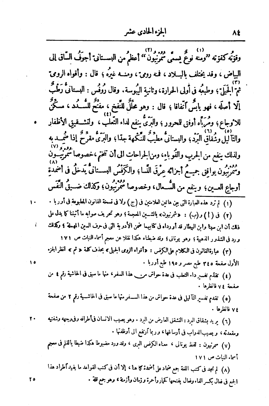 وقوّته كقوّته «ومنه «1» نوع يسمّى سمرنيون «2» » أعظم من البستانىّ أجوف السّاق إلى البياض، وقد يختلف بالبلاد، فمنه رومىّ، ومنه غيره؛ قال: وأقواه الرومىّ ثمّ «3» الجبلىّ؛ وطبعه فى أولى الحرارة، وثانية اليبوسة. وقال روفس: البستانىّ رطب إلّا أصله، فهو يابس اتّفاقا؛ قال: وهو محلّل للنّفخ، مفتّح للسّدد، مسكّن للأوجاع؛ ومربّاه أوفق للمحرور؛ والبرّىّ ينفع لداء الثّعلب «4» ، ولتشقيق الأظفار والثآليل «5» وشقاق «6» البرد؛ والبستانىّ مطيّب للنّكهة جدّا؛ والبرّىّ مقرّح إذا ضمد به ولذلك ينفع من الجرب والقوباء، ومن الجراحات الى أن تنختم، خصوصا سمرنيون «7» وسمرنيون يوافق جميع أجزائه عرق النّسا؛ والكرفس البستانىّ يدخل فى أضمدة «8» أوجاع العين؛ وينفع من السّعال، وخصوصا سمرنيون؛ وكذلك ضيق النّفس