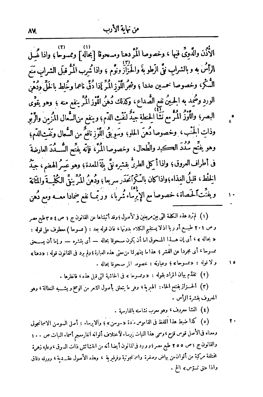 الأذن والّدوىّ فيها، وخصوصا المرّ دهنا ومسحوقا [بحاله «1» ] وممسوحا «2» ؛ واذا غسل الرأس به وبالشراب نقىّ الرّطوبة والحزاز «3» ونوّم؛ واذا شرب المرّ قبل الشراب منع السّكر، وخصوصا خمسين عددا؛ وشجر اللّوز المرّ إذا دقّ ناعما وخلط بالخلّ ودهن الورد وضمد به الجبين نفع الصّداع، وكذلك دهن اللّوز المرّ ينفع منه؛ وهو يقوّى البصر؛ واللّوز المرّ مع نشا «4» الحنطة جيّد لنفث الدّم؛ وينفع من السّعال المزمن والرّبو وذات الجنب، وخصوصا دهن الحلو؛ وسويق اللّوز نافع من السّعال ونفث الدّم؛ وهو يفتّح سدد الكبد والطّحال، وخصوصا المرّ، فإنّه يفتّح السّدد العارضة فى أطراف العروق؛ واذا أكل الطرىّ بقشره نقىّ بلّة المعدة؛ وهو عسر الهضم، جيّد الخلط، قليل الغذاء؛ واذا كان بالسّكّر انحدر سريعا؛ ودهن المرّ ينقّى الكلية والمثانة ويفتّت الحصاة، خصوصا مع الإيرساء «5» شربا، وربّما نفع ضمادا معه ومع دهن