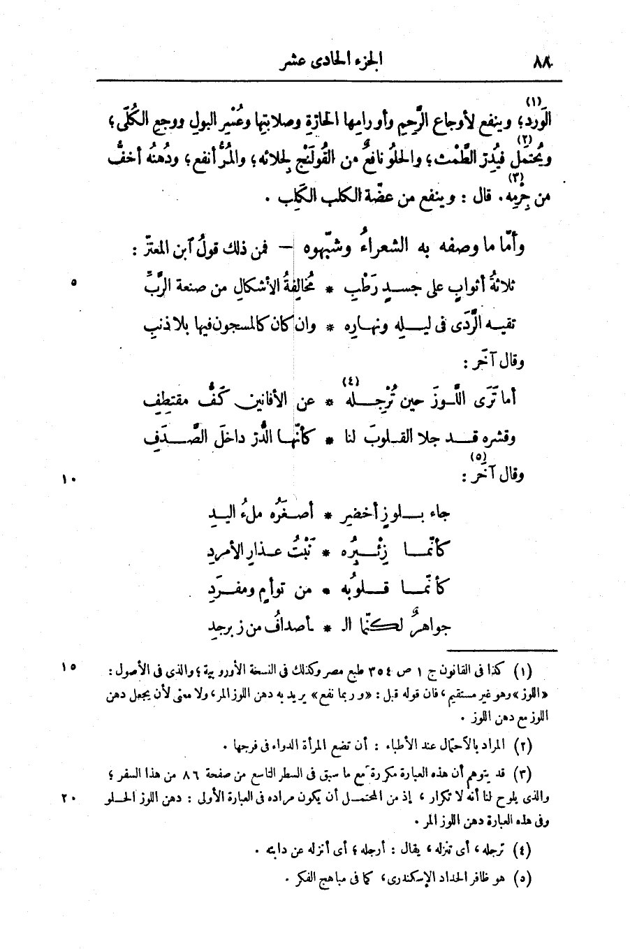 الورد «1» ؛ وينفع لأوجاع الرّحم وأورامها الحارّة وصلابتها وعسر البول ووجع الكلّى؛ ويحتمل «2» فيدرّ الطّمث؛ والحلو نافع من القولنج لجلائه؛ والمرّ أنفع؛ ودهنه أخفّ من جرمه «3» . قال: وينفع من عضّة الكلب الكلب.