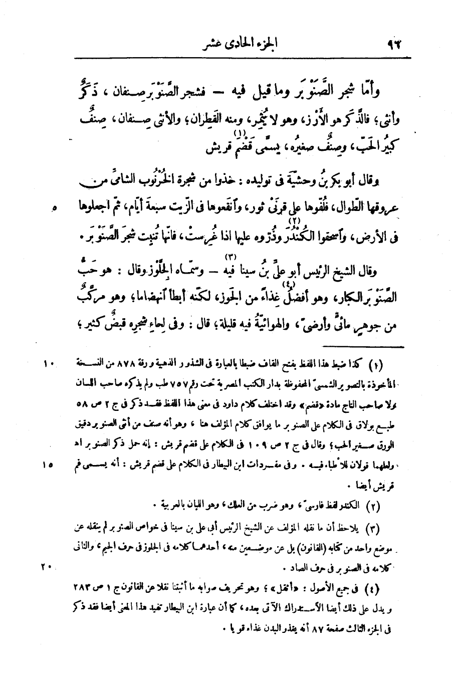 وقال الشيخ الرئيس أبو علىّ بن سينا فيه «3» - وسمّاه الجلّوز وقال: هو حبّ الصّنوبر الكبار، وهو أفضل «4» غذاء من الجوز، لكنّه أبطأ انهضاما؛ وهو مركّب من جوهر مائىّ وأرضىّ، والهوائيّة فيه قليلة؛ قال: وفى لحاء شجره قبض كثير؛