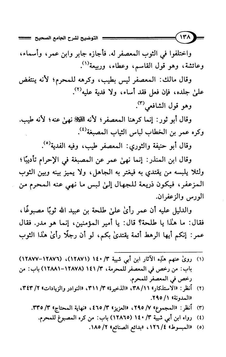 (¬1) روى عنهم هذِه الآثار ابن أبي شيبة 3/ 140 (12871)، (12876 - 12877) باب: من رخص في المعصفر للمحرمة، 3/ 141 (12878 - 12881) باب: من رخص في المعصفر للمحرم.